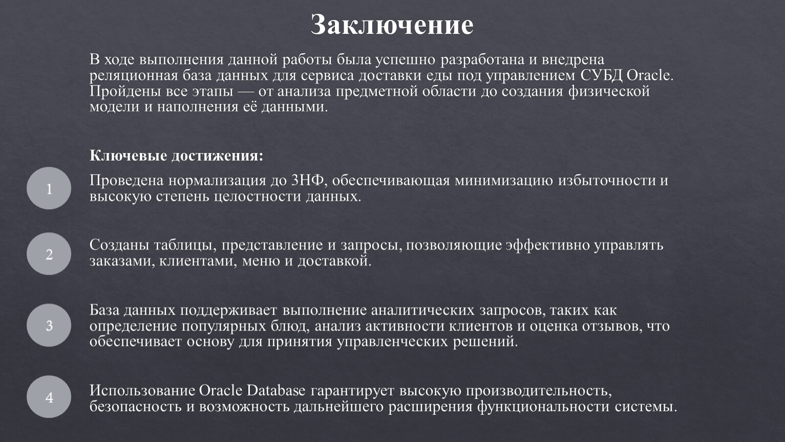 В ходе выполнения данной работы была успешно разработана и внедрена реляционная база данных для сервиса доставки еды под управлением СУБД Oracle. Пройдены все этапы — от анализа предметной области до создания физической модели и наполнения её данными.