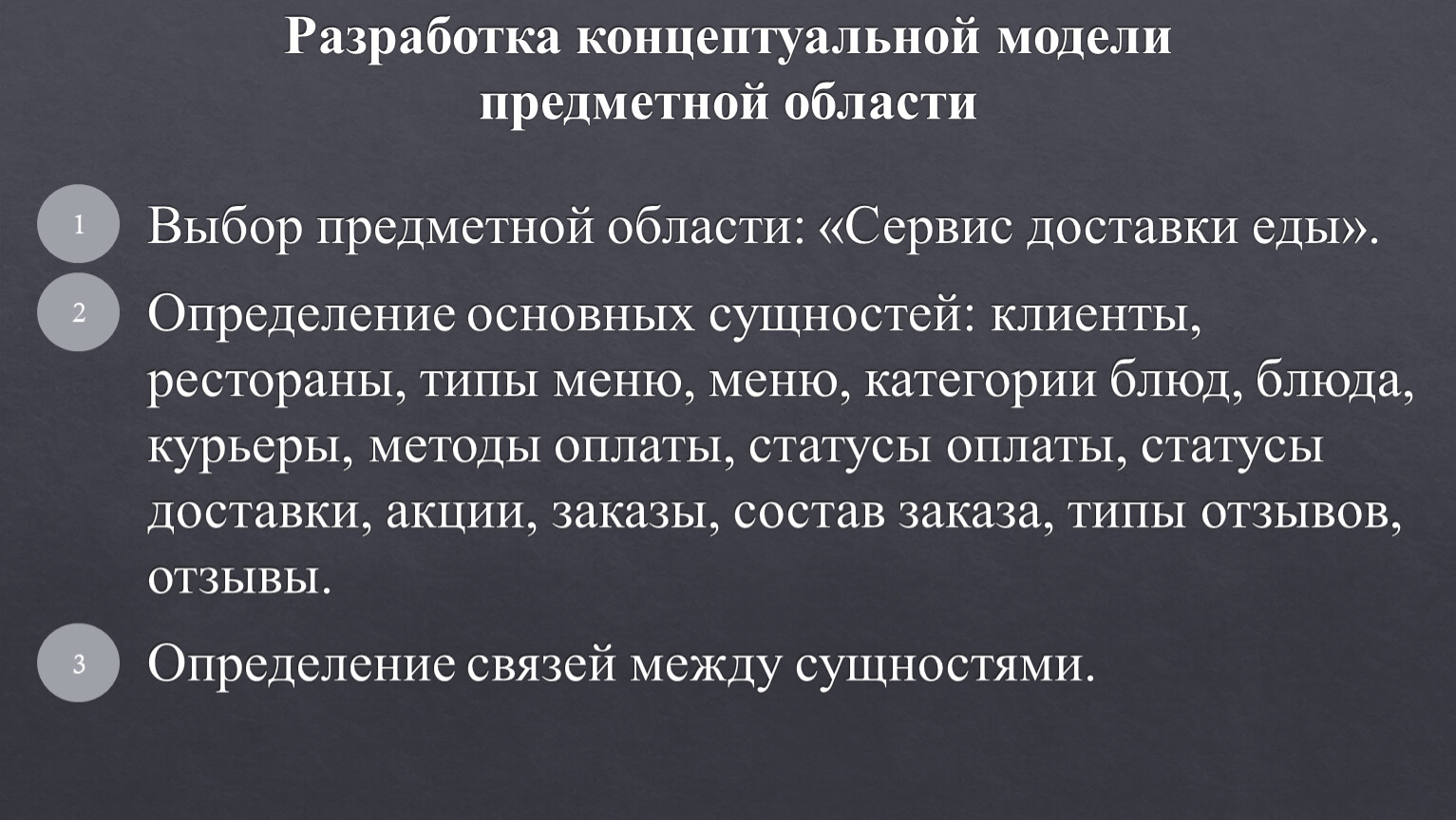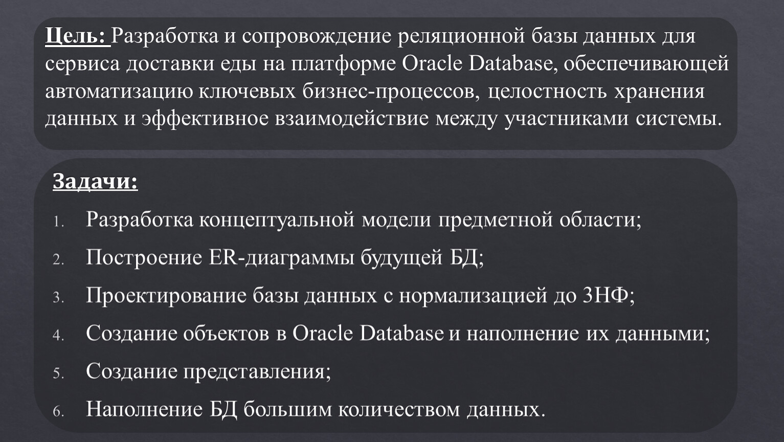 Цель: Разработка и сопровождение реляционной базы данных для сервиса доставки еды на платформе Oracle Database, обеспечивающей автоматизацию ключевых бизнес-процессов, целостность хранения данных и эффективное взаимодействие между участниками системы.