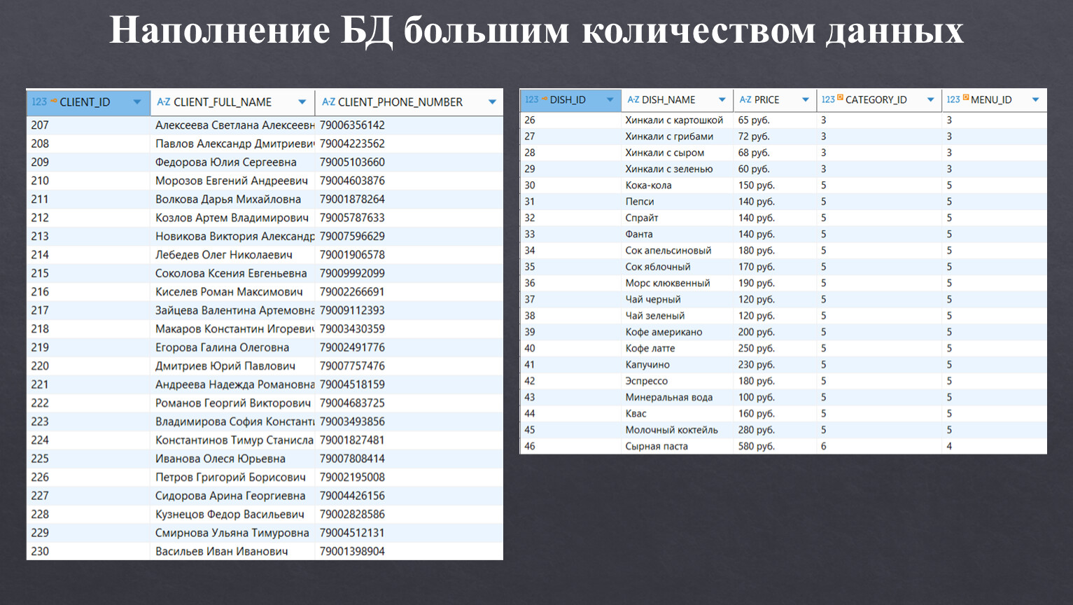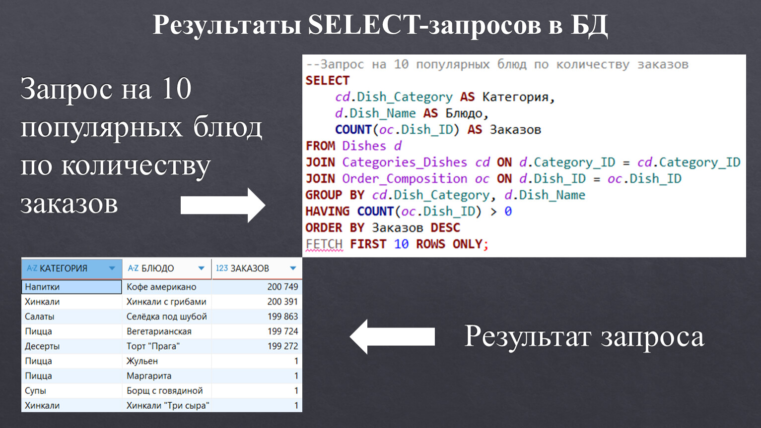 База данных поддерживает выполнение аналитических запросов, таких как определение популярных блюд, анализ активности клиентов и оценка отзывов, что обеспечивает основу для принятия управленческих решений.