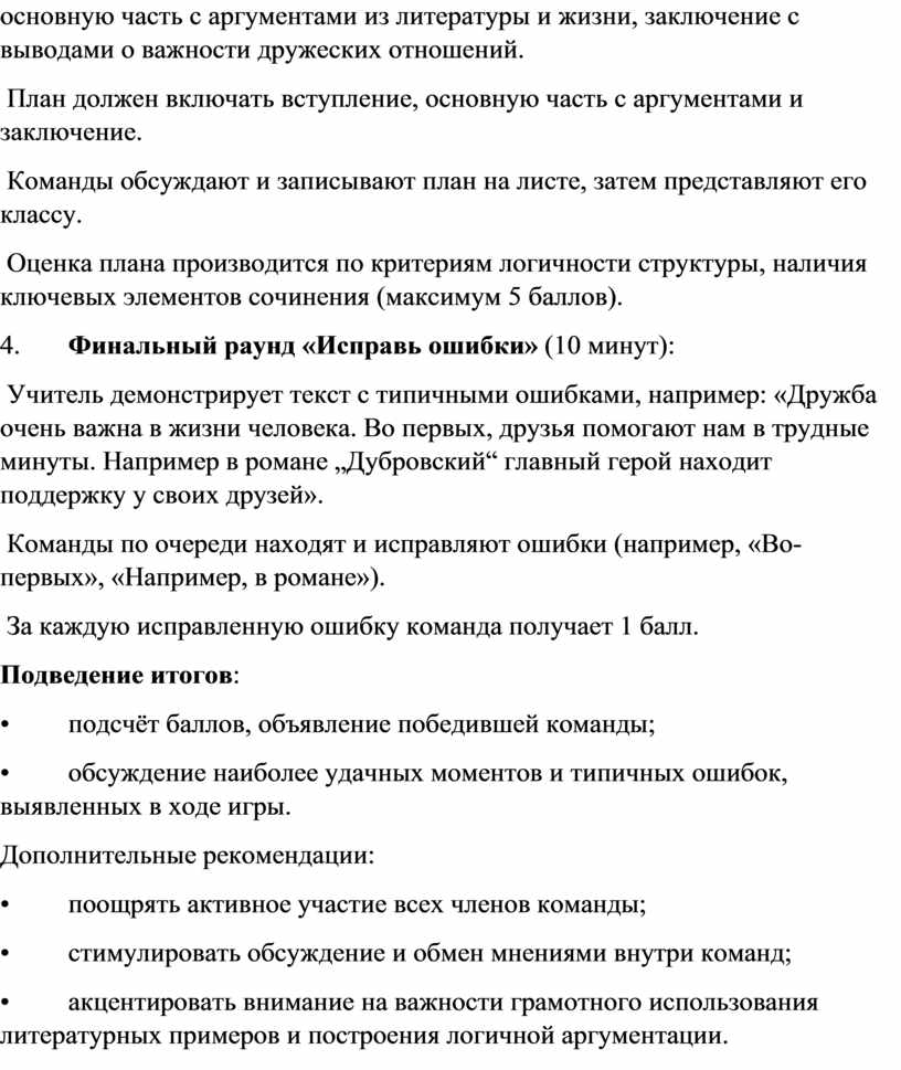 Команды получают задание составить план сочинения на основе одной из ранее обсуждённых тем. Например, по теме «Значение дружбы в жизни человека» план может включать вступление с определением дружбы, основную часть с аргументами из литературы и жизни, заключение с выводами о важности дружеских отношений.
