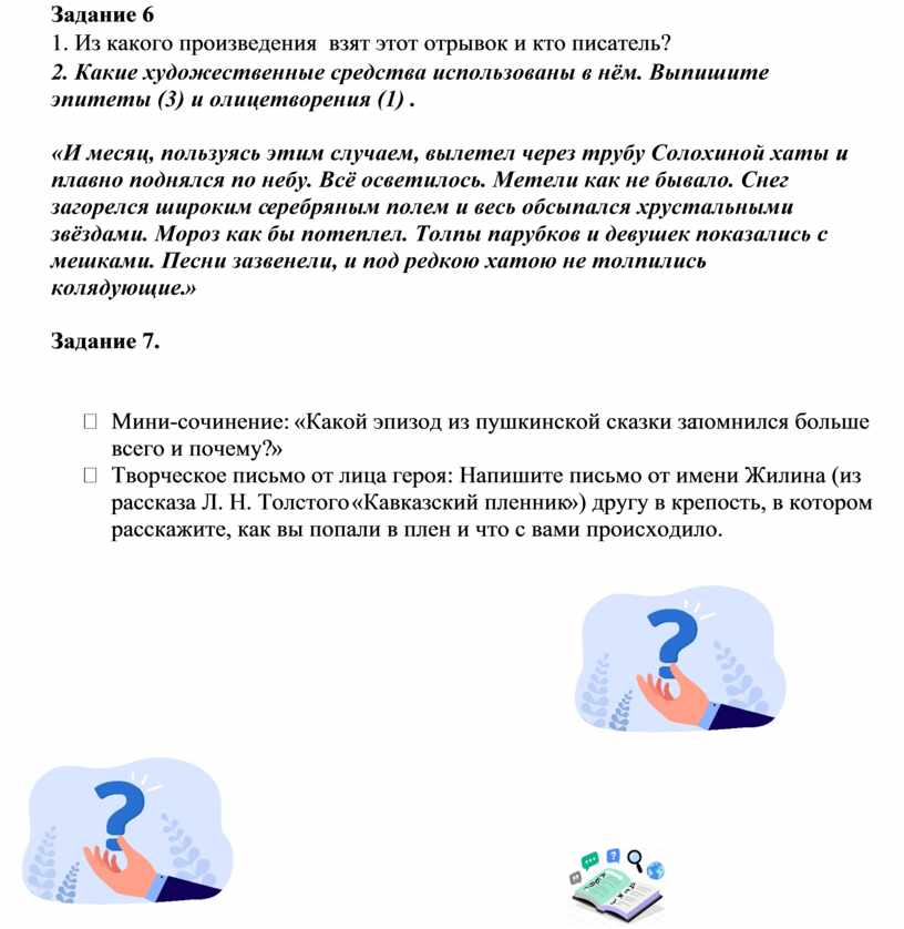 Ø Творческое письмо от лица героя: Напишите письмо от имени Жилина (из рассказа Л. Н. Толстого «Кавказский пленник») другу в крепость, в котором расскажите, как вы попали в плен и что с вами происходило.