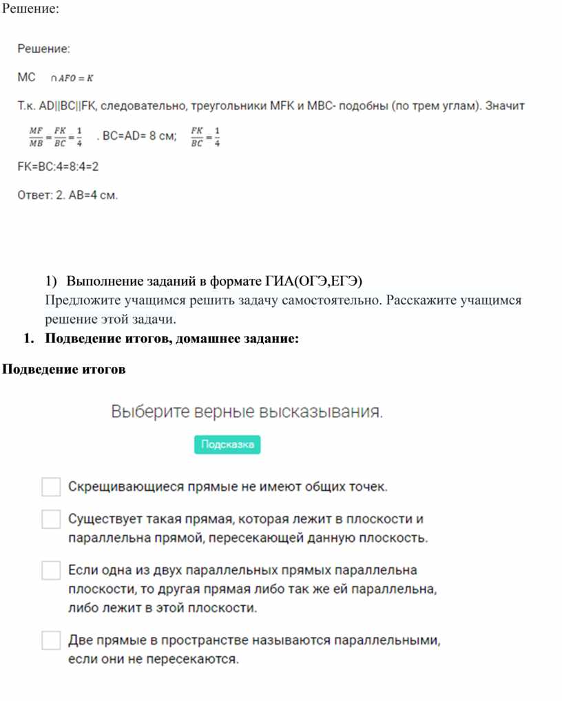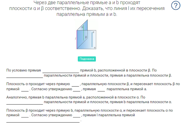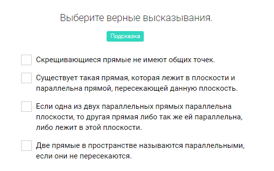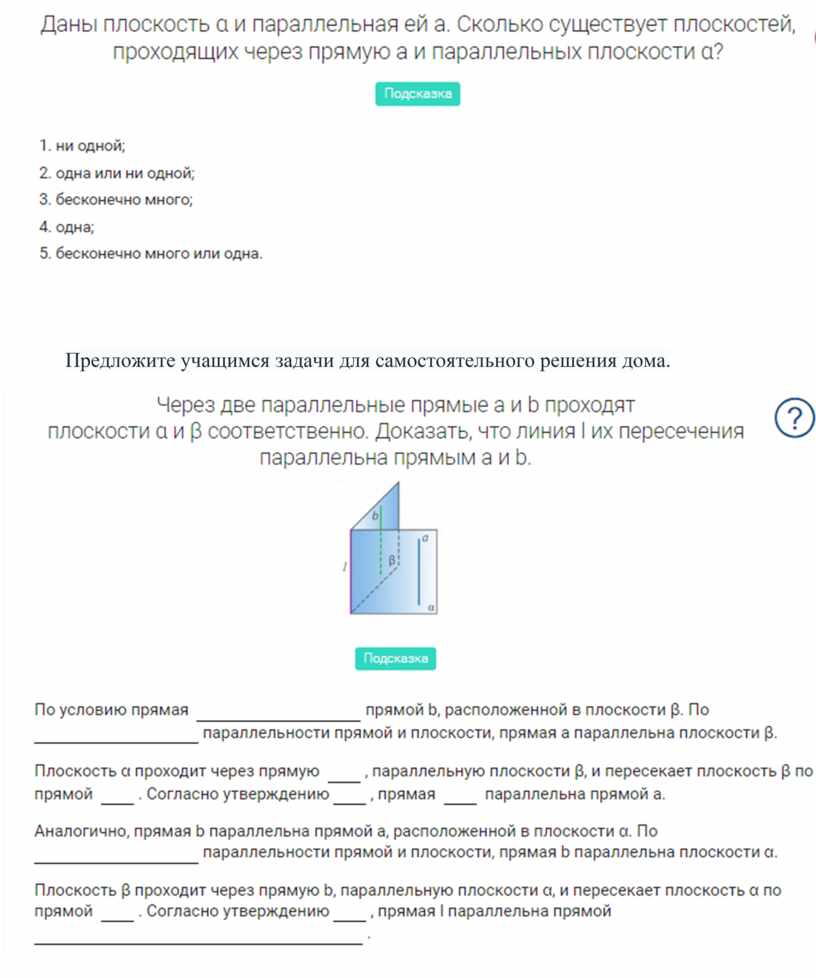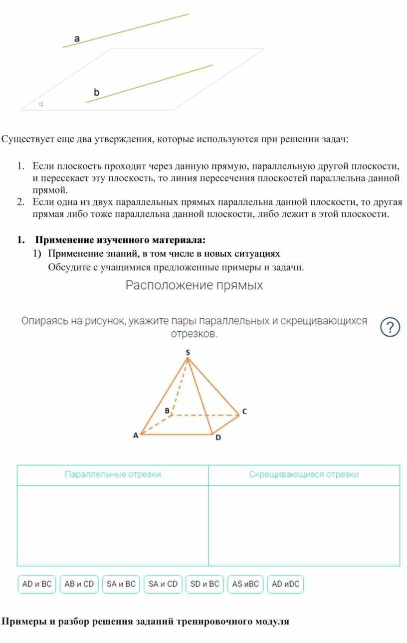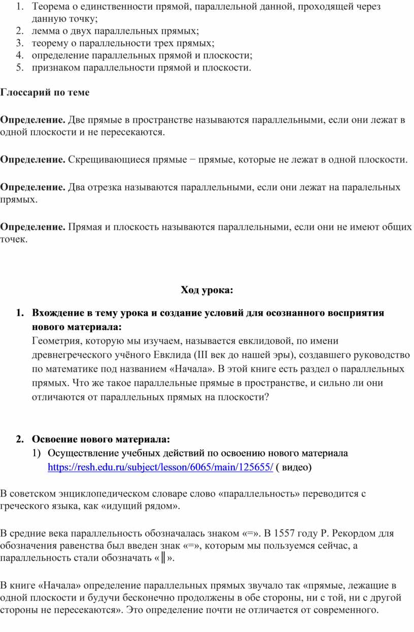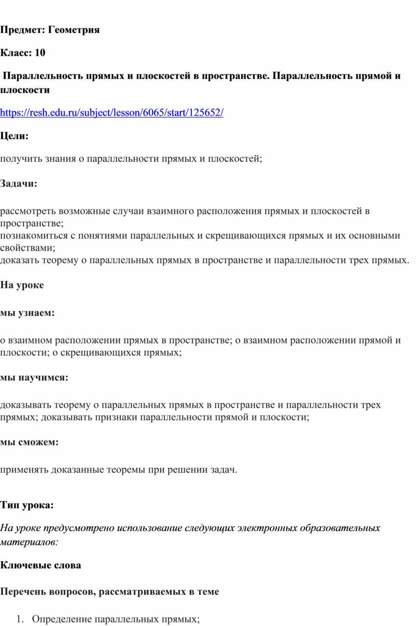 · доказывать теорему о параллельных прямых в пространстве и параллельности трех прямых; доказывать признаки параллельности прямой и плоскости;