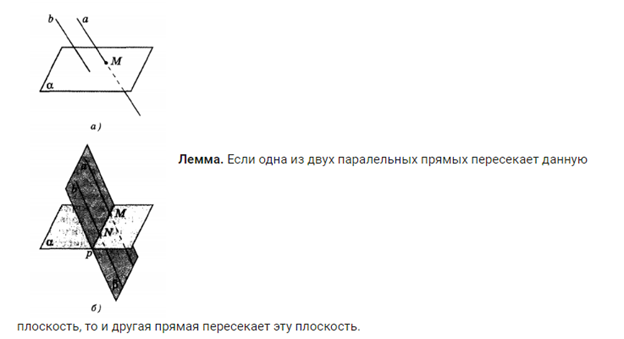 Значит, прямая c, которая параллельна прямой b, тоже пересекает плоскость α. Так как a∥c, то получается, что a тоже пересекает эту плоскость. Но прямая a не может одновременно пересекать плоскость α и находиться в плоскости α. Получаем противоречие, следовательно, предположение, что прямая b пересекает плоскость α, является неверным. Значит, прямая b находится в плоскости α.