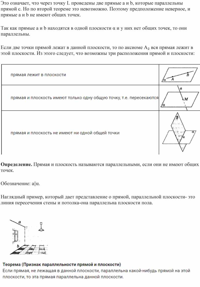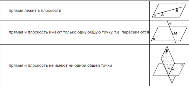 Если две точки прямой лежат в данной плоскости, то по аксиоме А₂ вся прямая лежит в этой плоскости. Из этого следует, что возможны три расположения прямой и плоскости: