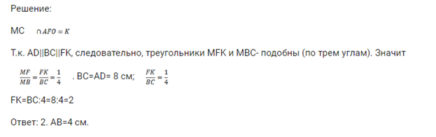 Точка М не лежит в плоскости ромба ABCD. На отрезке АМ выбрана точка Е так, что MЕ:ЕА=1:3. Точка F – точка пересечения прямой МВ с плоскостью CDE. Найдите АВ, если AD= 8 cм.