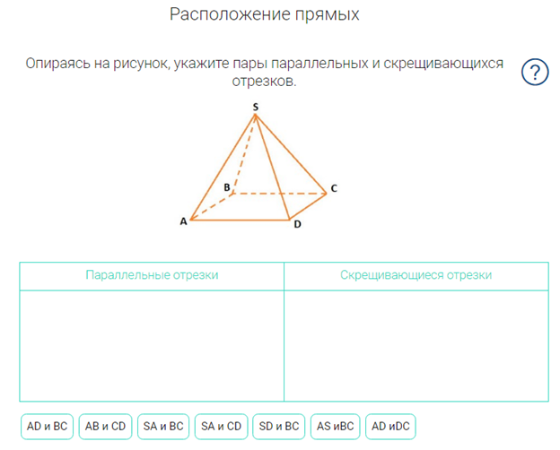 А теперь рассмотрим некоторые пары скрещивающихся прямых, как мы отметили, они не должны лежать в одной плоскости: