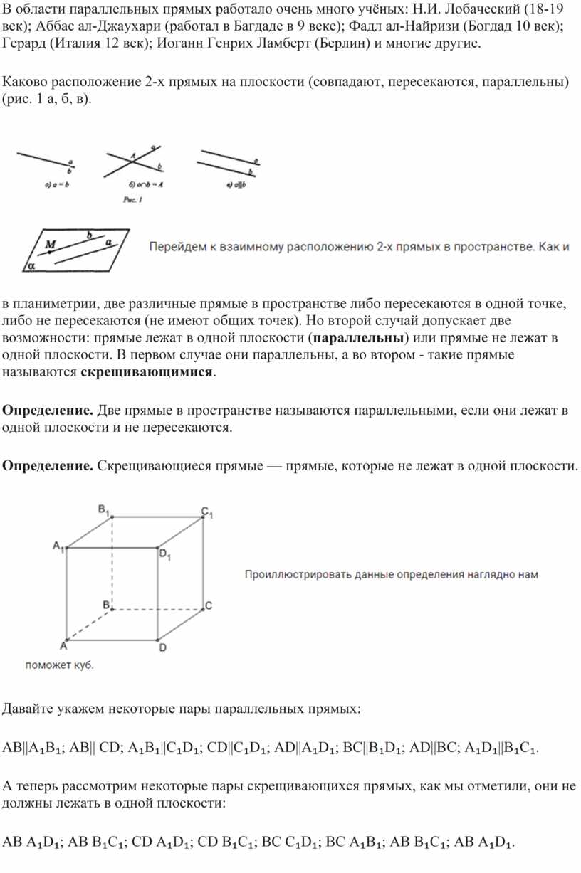 · познакомиться с понятиями параллельных и скрещивающихся прямых и их основными свойствами;