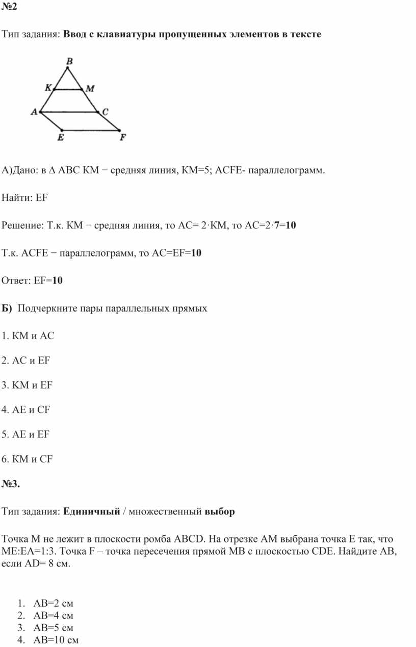 А)Дано: в ∆ АВС КМ − средняя линия, КМ=5; ACFE- параллелограмм.