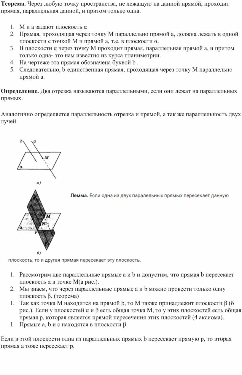 Теорема. Через любую точку пространства, не лежащую на данной прямой, проходит прямая, параллельная данной, и притом только одна.