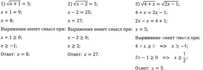 Примеры: Ответ: х=4 следовательно, решений нет Ответ: решений нет. |