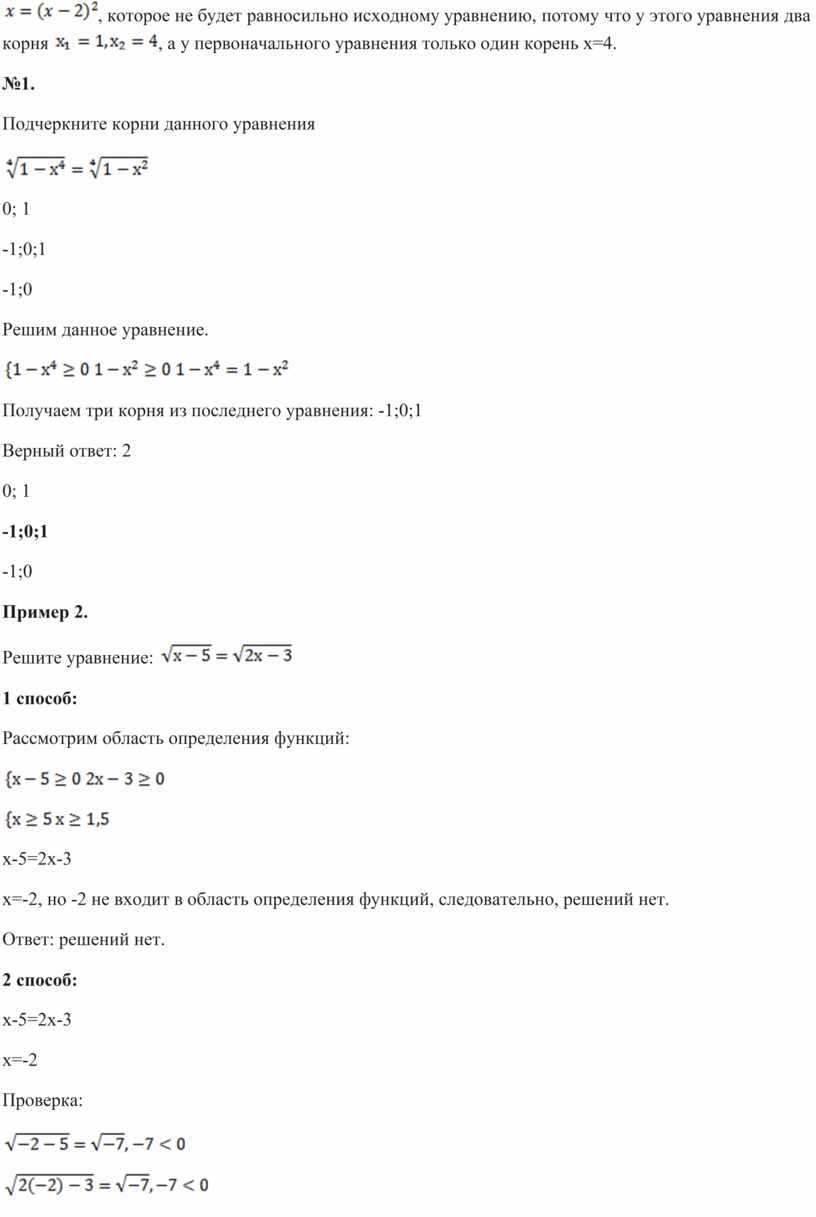 №1. Подчеркните корни данного уравнения 1. 0; 1 2. -1;0;1 3. -1;0 Решим данное уравнение. Получаем три корня из последнего уравнения: -1;0;1 Верный ответ: 2 1. 0; 1 2. -1;0;1 3. -1;0 Пример 2. Решите уравнение: 1 способ: Рассмотрим область определения функций: х-5=2х-3 х=-2, но -2 не входит в область определения функций, следовательно, решений нет. Ответ: решений нет. 2 способ: х-5=2х-3 х=-2 Проверка: Значит, х=-2- посторонний корень Ответ: решений нет. |