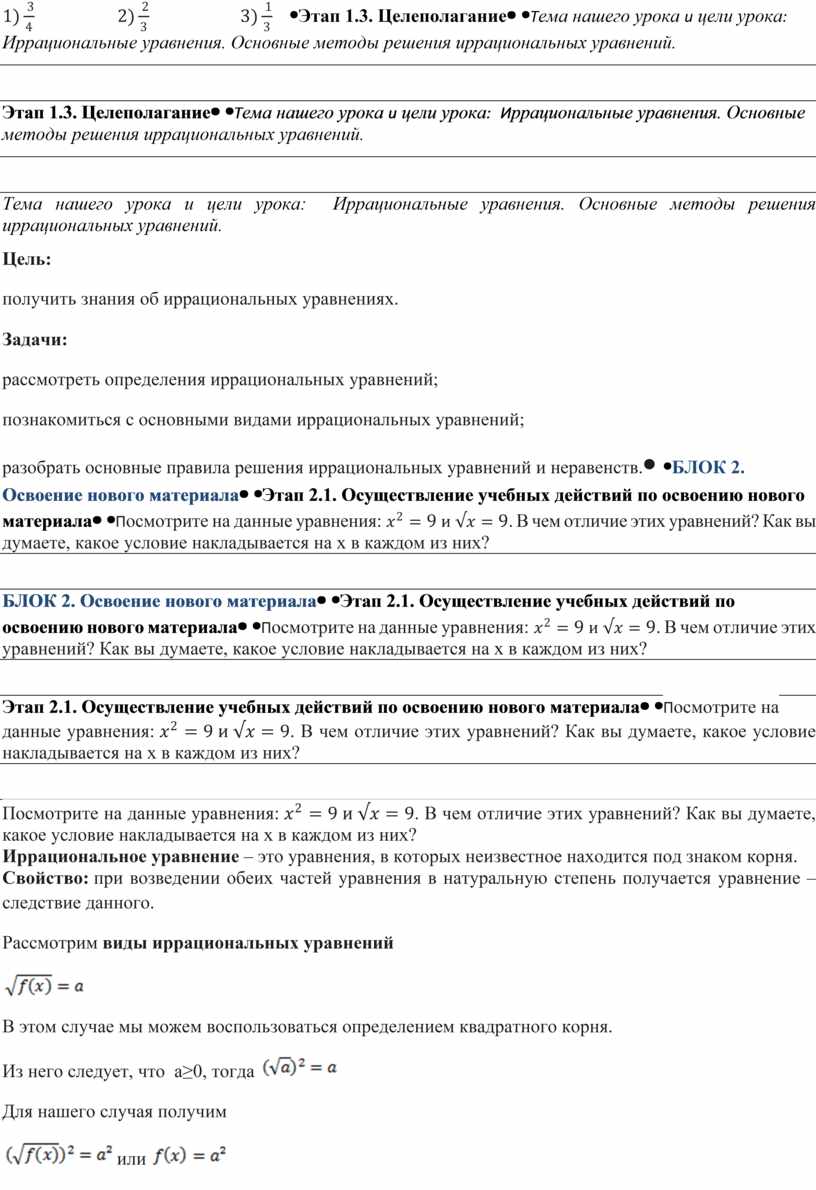 Предметные: формирование знания об иррациональных уравнениях, основных видах иррациональных уравнений; умение решать иррациональные уравнения различными способами. |