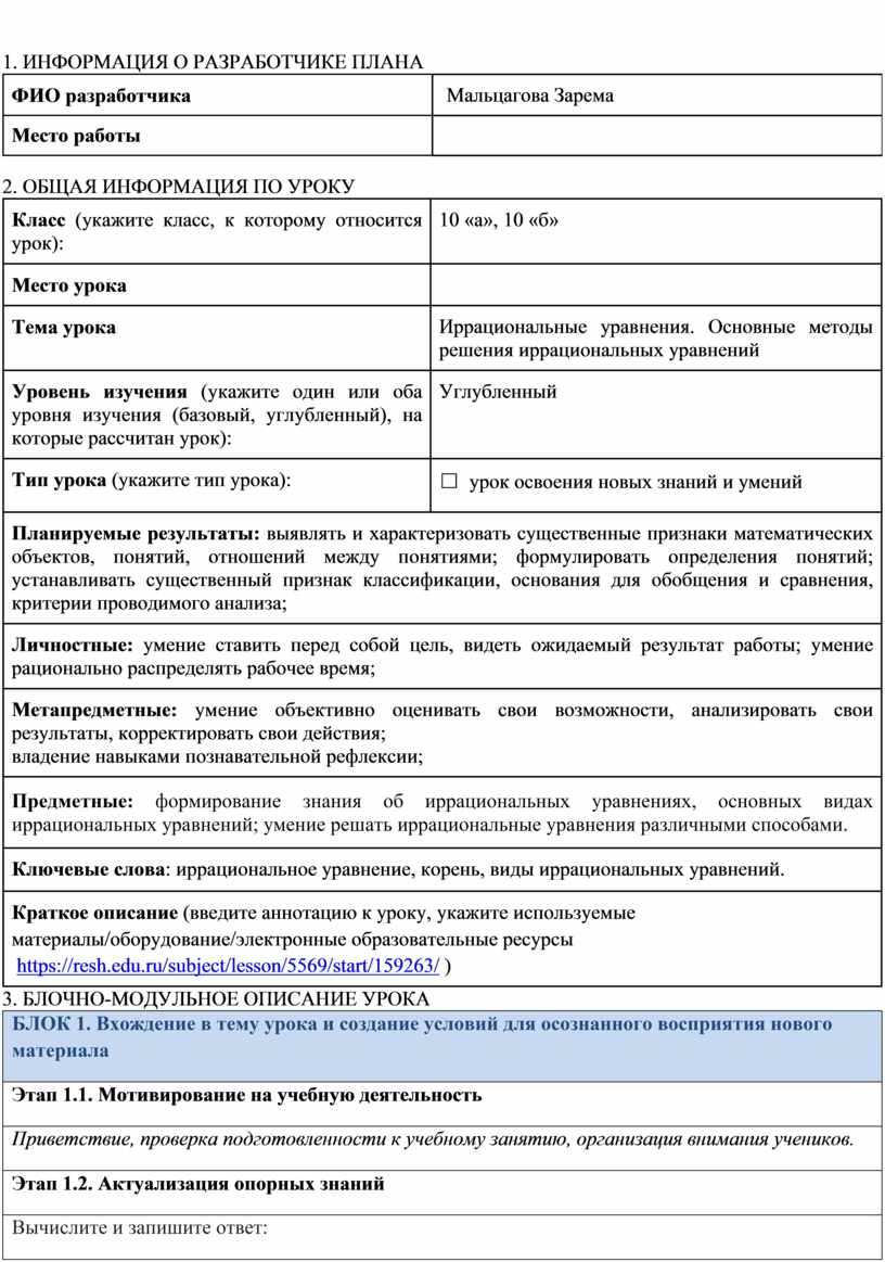 3. БЛОЧНО-МОДУЛЬНОЕ ОПИСАНИЕ УРОКА