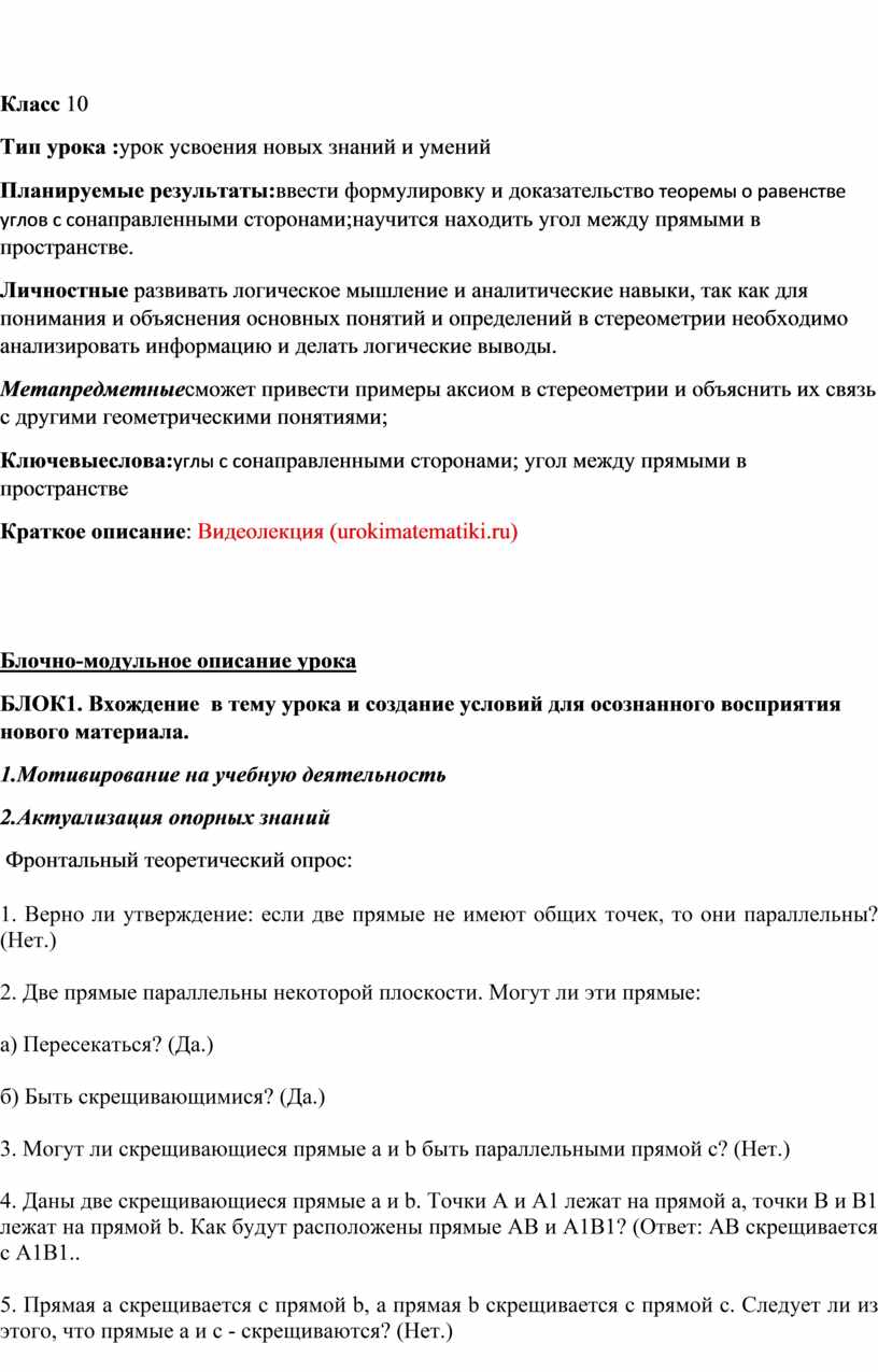 Планируемые результаты:ввести формулировку и доказательство теоремы о равенстве углов с сонаправленными сторонами;научится находить угол между прямыми в пространстве.