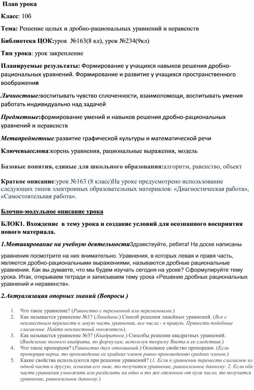 Тема: Решение целых и дробно-рациональных уравнений и неравенств