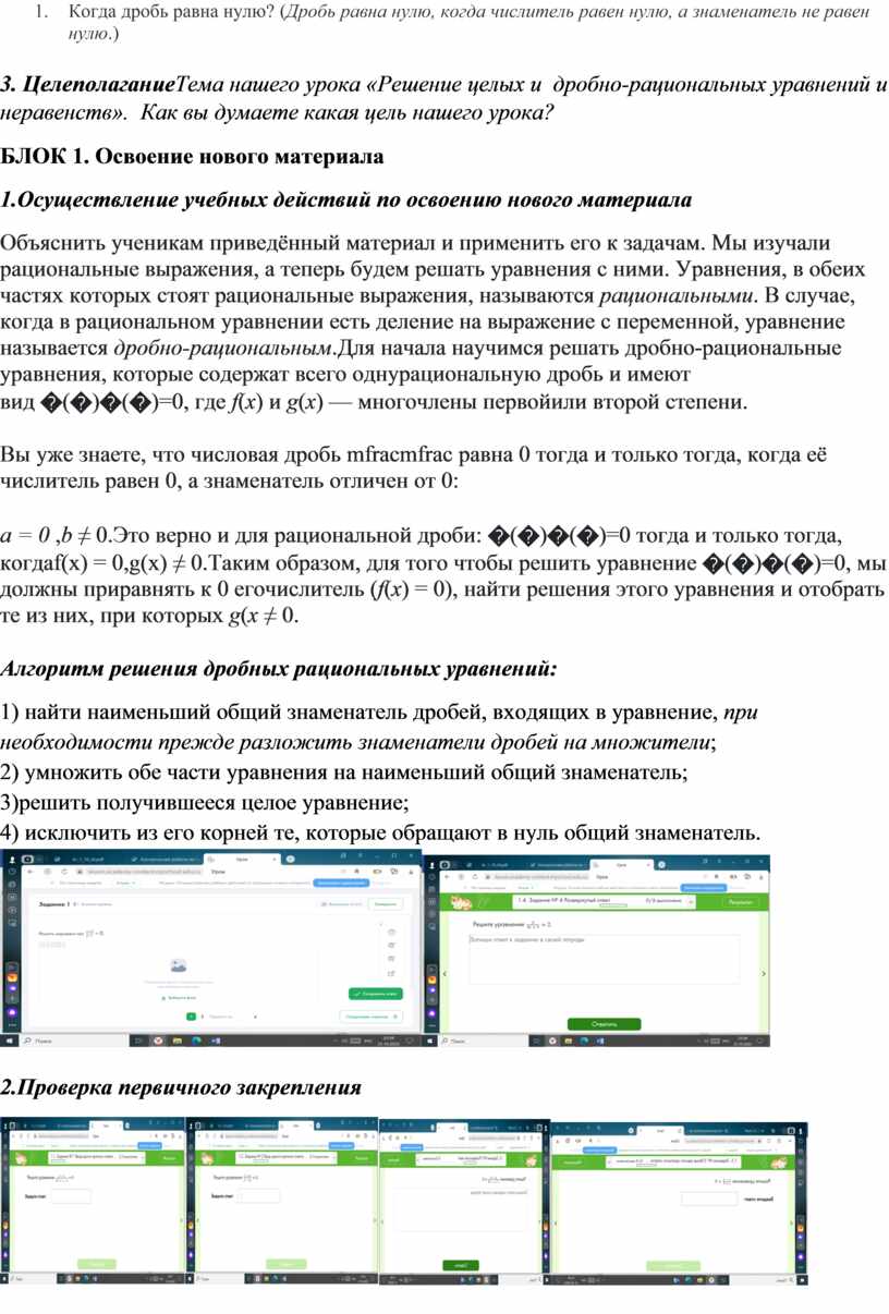 Объяснить ученикам приведённый материал и применить его к задачам. Мы изучали рациональные выражения, а теперь будем решать уравнения с ними. Уравнения, в обеих частях которых стоят рациональные выражения, называются рациональными. В случае, когда в рациональном уравнении есть деление на выражение с переменной, уравнение называется дробно-рациональным.Для начала научимся решать дробно-рациональные уравнения, которые содержат всего однурациональную дробь и имеют вид �(�)�(�)=0, где f(x) и g(x) — многочлены первойили второй степени.