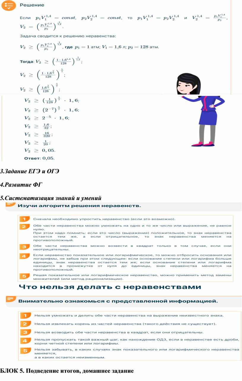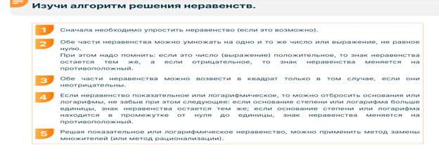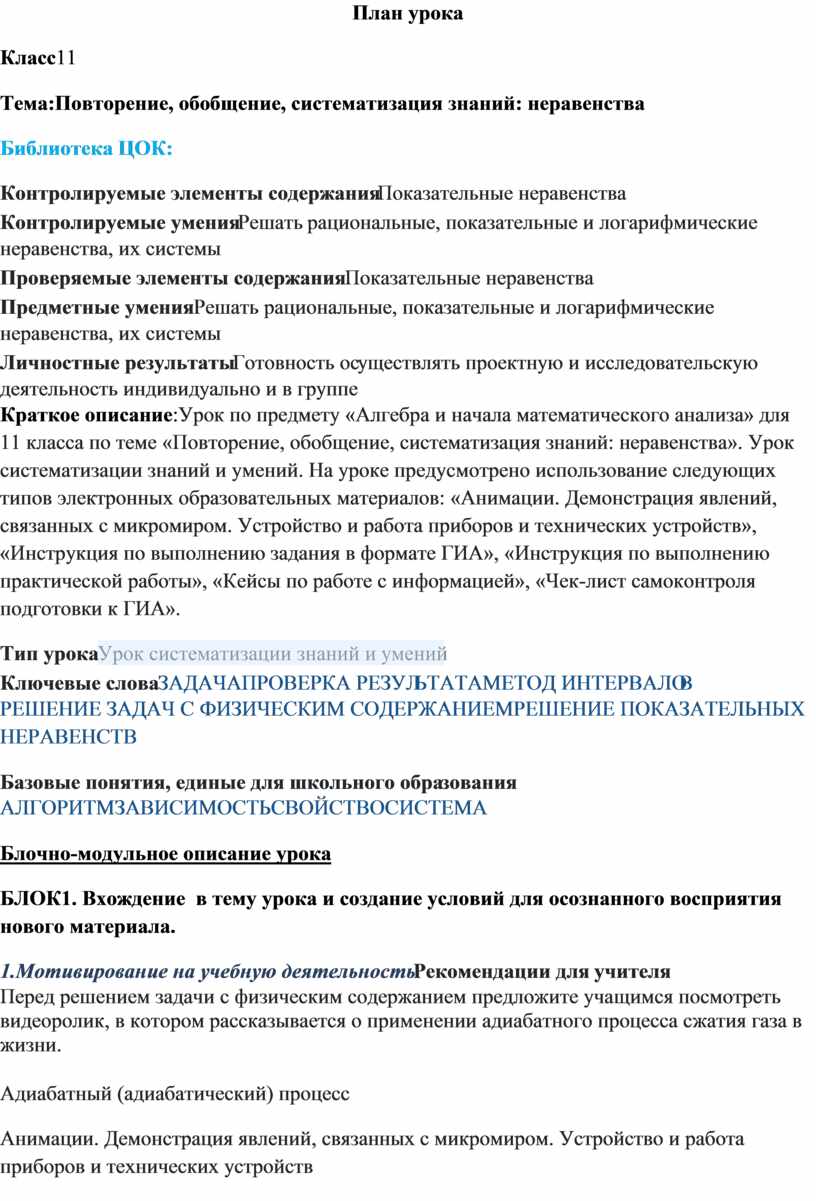 Краткое описание:Урок по предмету «Алгебра и начала математического анализа» для 11 класса по теме «Повторение, обобщение, систематизация знаний: неравенства». Урок систематизации знаний и умений. На уроке предусмотрено использование следующих типов электронных образовательных материалов: «Анимации. Демонстрация явлений, связанных с микромиром. Устройство и работа приборов и технических устройств», «Инструкция по выполнению задания в формате ГИА», «Инструкция по выполнению практической работы», «Кейсы по работе с информацией», «Чек-лист самоконтроля подготовки к ГИА».