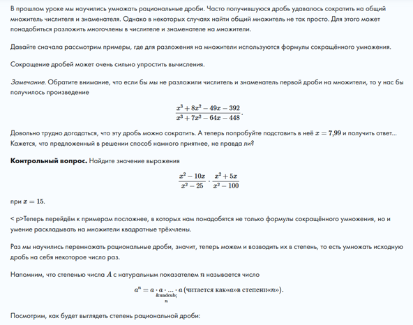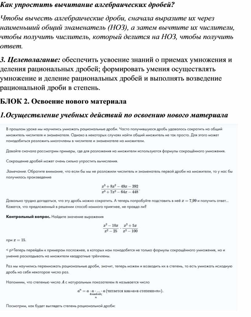 3. Целеполагание: обеспечить усвоение знаний о приемах умножения и деления рациональных дробей; формировать умения осуществлять умножение и деление рациональных дробей и выполнять возведение рациональной дроби в степень.
