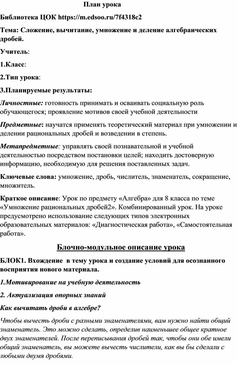 Краткое описание: Урок по предмету «Алгебра» для 8 класса по теме «Умножение рациональных дробей2». Комбинированный урок. На уроке предусмотрено использование следующих типов электронных образовательных материалов: «Диагностическая работа», «Самостоятельная работа».
