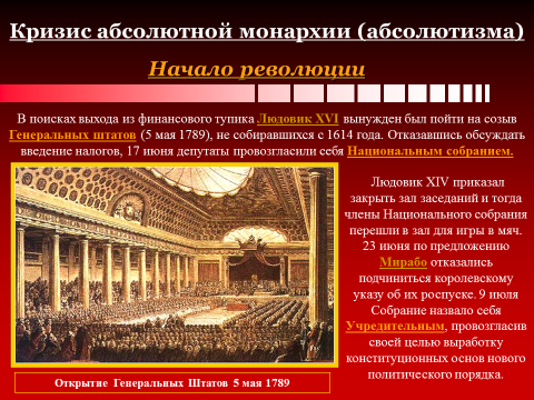 В поисках выхода из финансового тупика Людовик XVI вынужден был пойти на созыв Генеральных штатов (5 мая 1789), не собиравшихся с 1614 года. Отказавшись обсуждать введение налогов, 17 июня депутаты провозгласили себя Национальным собранием.