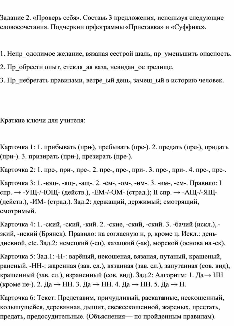 Карточка 6: Текст: Представим, причудливый, раскатанные, нескошенный, колышущейся, деревянная, дышит, свежескошенной, жареных, престать, предать, предосудительные. (Объяснения — по пройденным правилам).
