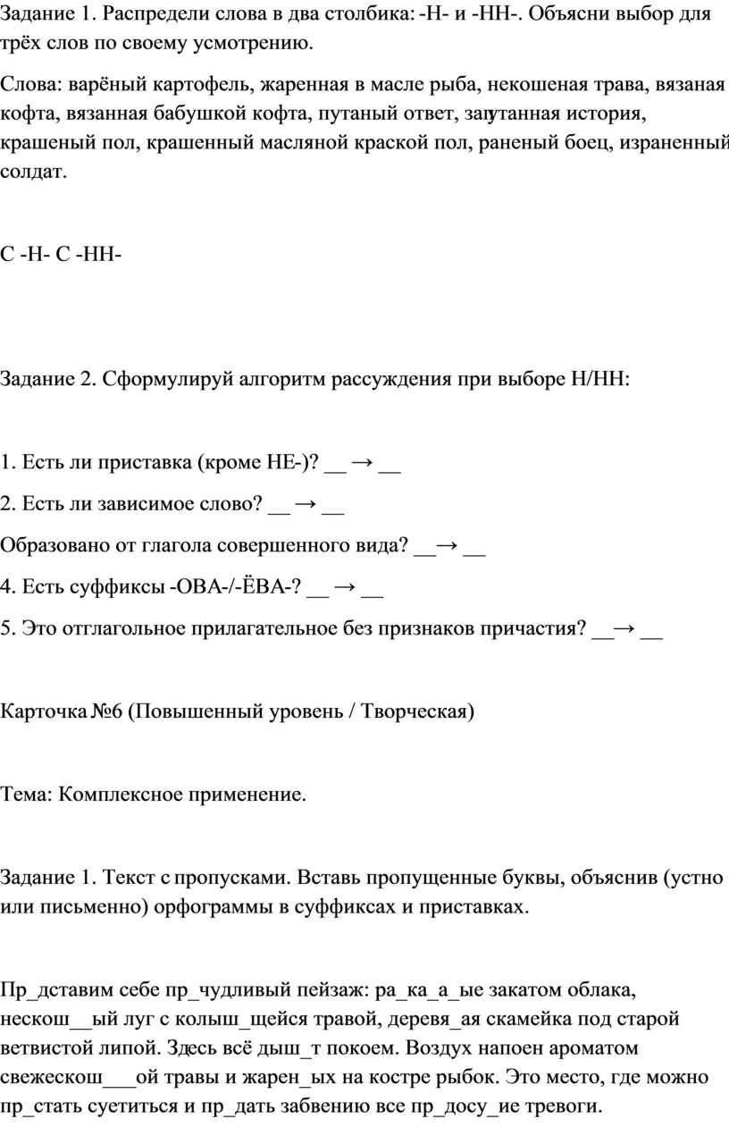 Карточка 5: Зад.1: -Н-: варёный, некошеная, вязаная, путаный, крашеный, раненый. -НН-: жаренная (зав. сл.), вязанная (зав. сл.), запутанная (сов. вид), крашенный (зав. сл.), израненный (сов. вид). Зад.2: Алгоритм: 1. Да → НН (кроме не-). 2. Да → НН. 3. Да → НН. 4. Да → НН. 5. Да → Н.