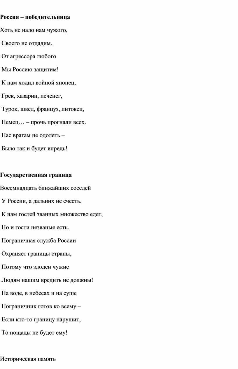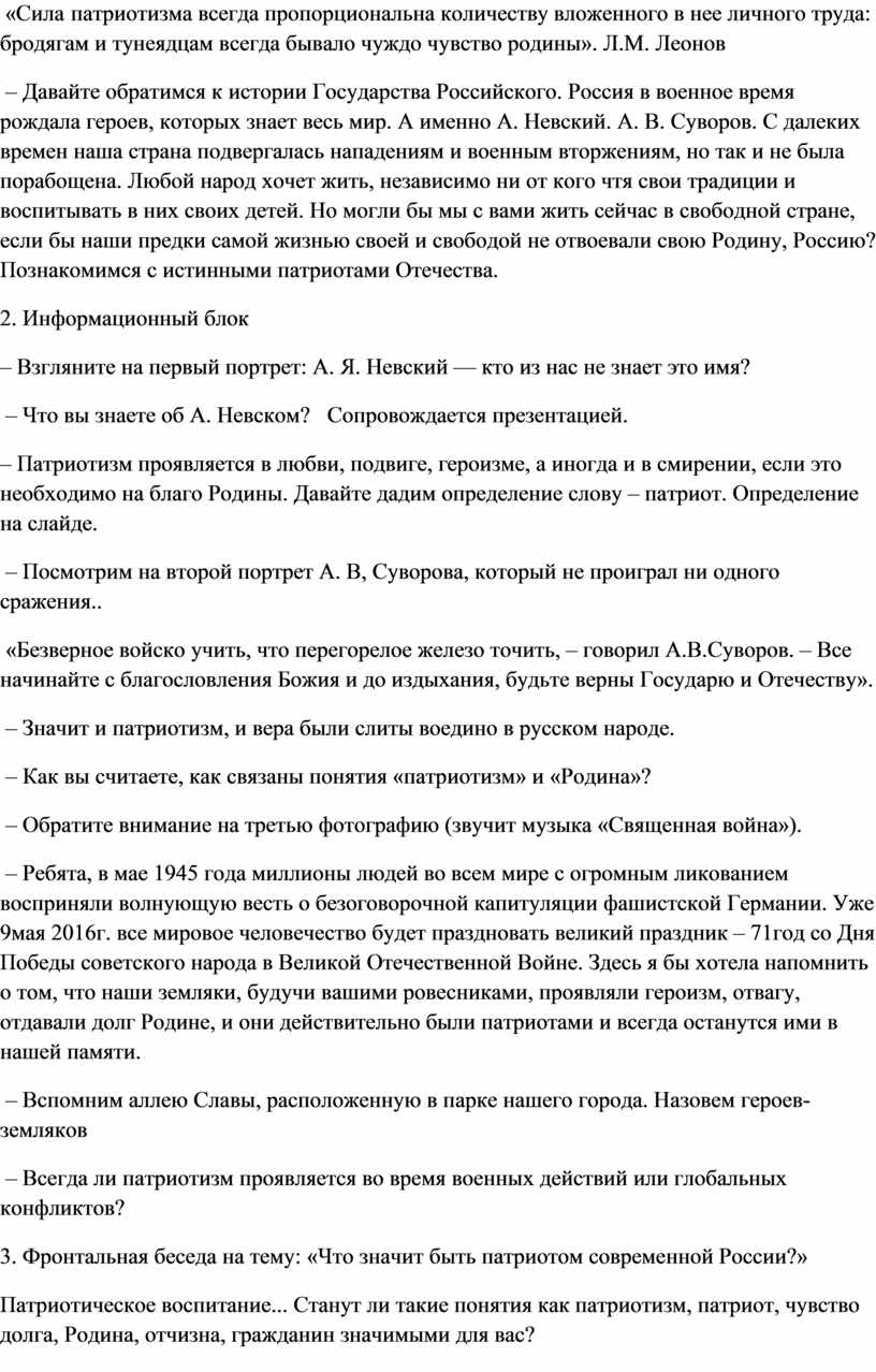 – Давайте обратимся к истории Государства Российского. Россия в военное время рождала героев, которых знает весь мир. А именно А. Невский. А. В. Суворов. С далеких времен наша страна подвергалась нападениям и военным вторжениям, но так и не была порабощена. Любой народ хочет жить, независимо ни от кого чтя свои традиции и воспитывать в них своих детей. Но могли бы мы с вами жить сейчас в свободной стране, если бы наши предки самой жизнью своей и свободой не отвоевали свою Родину, Россию? Познакомимся с истинными патриотами Отечества.