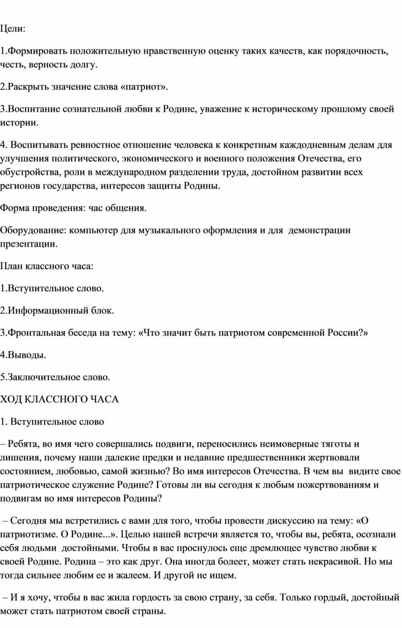 – Сегодня мы встретились с вами для того, чтобы провести дискуссию на тему: «О патриотизме. О Родине...». Целью нашей встречи является то, чтобы вы, ребята, осознали себя людьми достойными. Чтобы в вас проснулось еще дремлющее чувство любви к своей Родине. Родина – это как друг. Она иногда болеет, может стать некрасивой. Но мы тогда сильнее любим ее и жалеем. И другой не ищем.