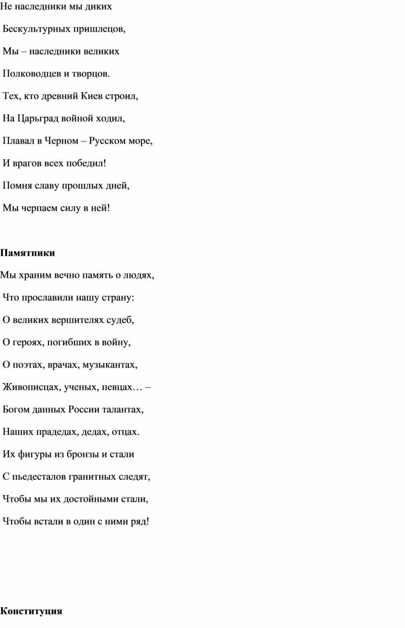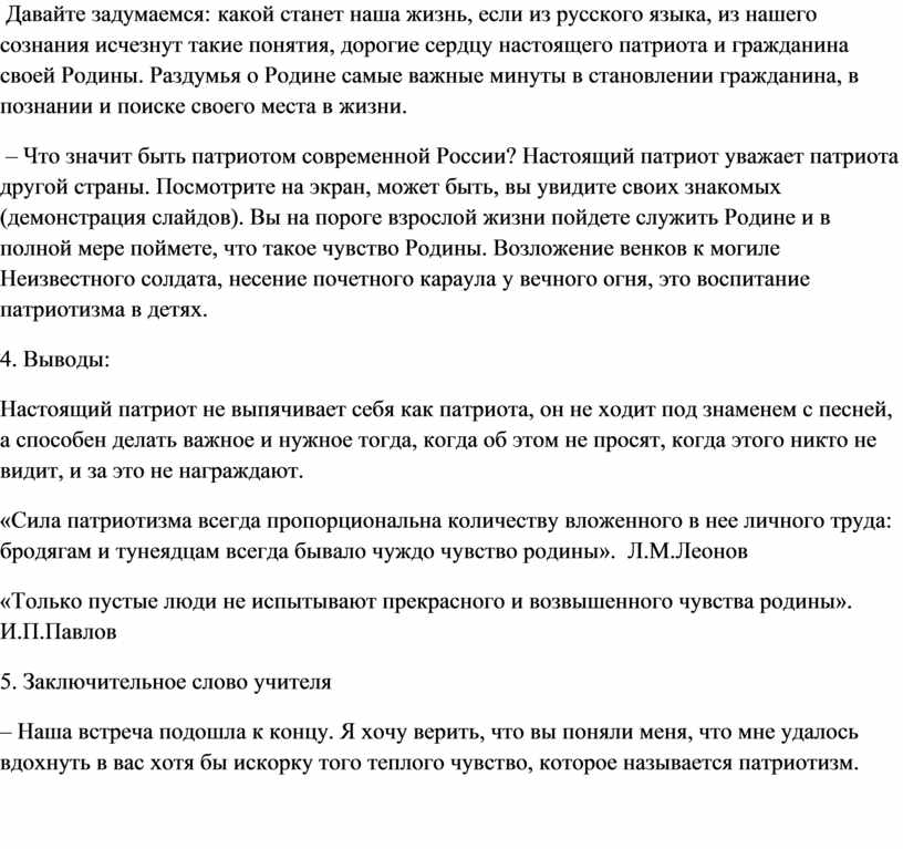 Давайте задумаемся: какой станет наша жизнь, если из русского языка, из нашего сознания исчезнут такие понятия, дорогие сердцу настоящего патриота и гражданина своей Родины. Раздумья о Родине самые важные минуты в становлении гражданина, в познании и поиске своего места в жизни.