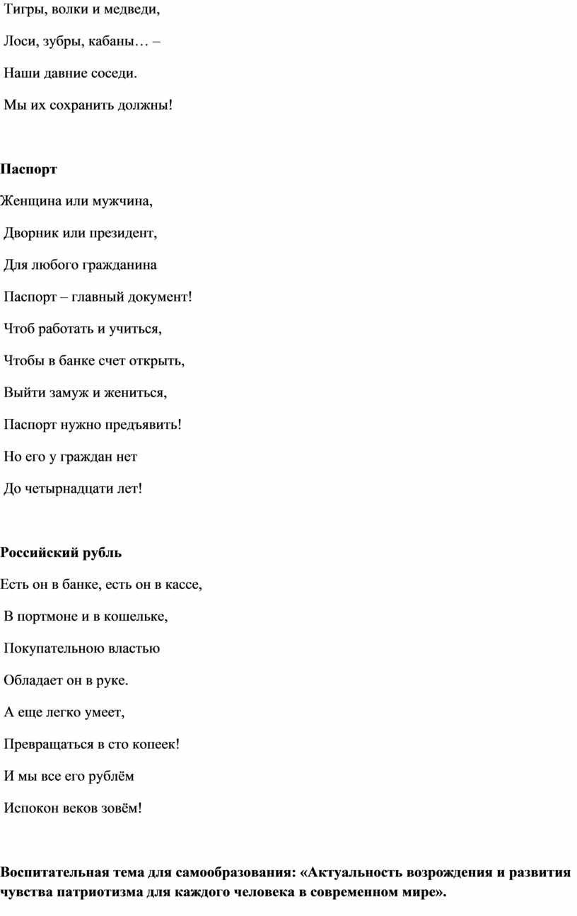 Воспитательная тема для самообразования: «Актуальность возрождения и развития чувства патриотизма для каждого человека в современном мире».
