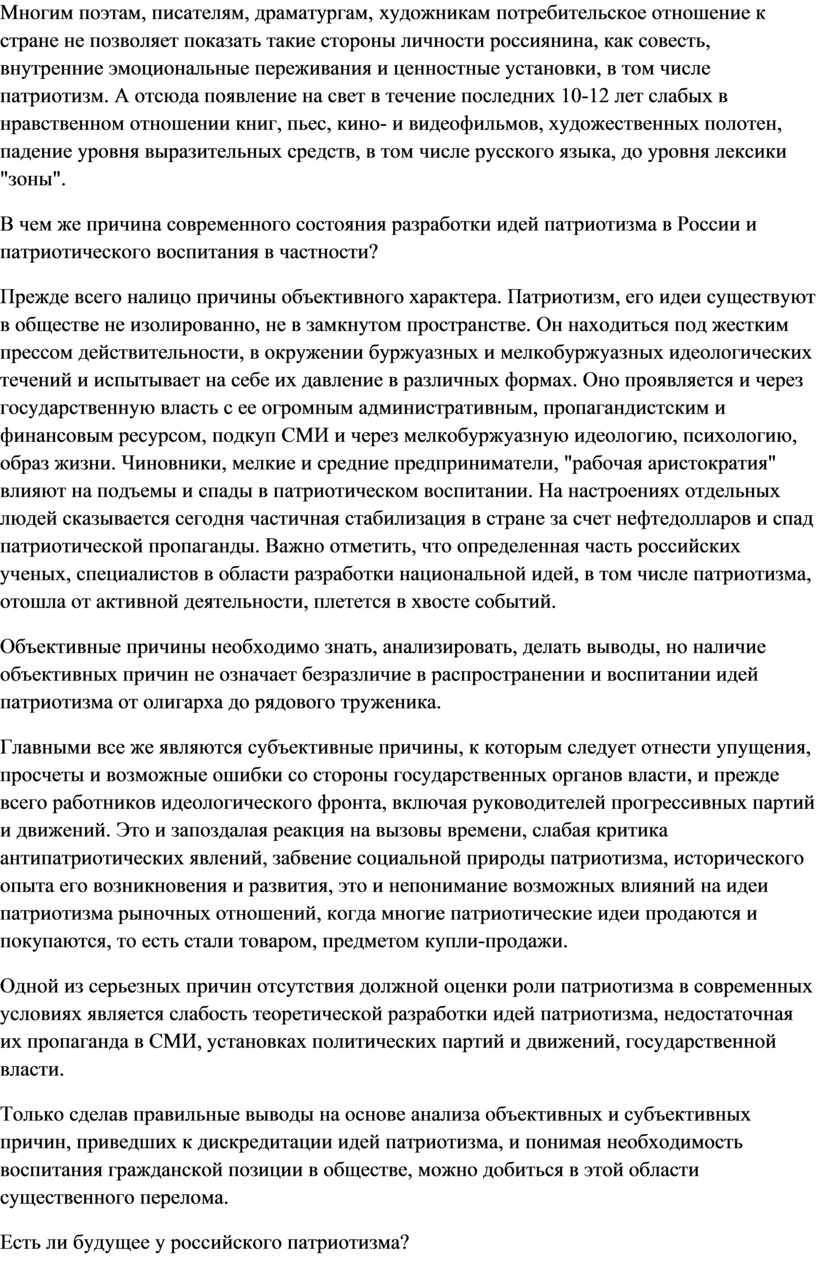 Главными все же являются субъективные причины, к которым следует отнести упущения, просчеты и возможные ошибки со стороны государственных органов власти, и прежде всего работников идеологического фронта, включая руководителей прогрессивных партий и движений. Это и запоздалая реакция на вызовы времени, слабая критика антипатриотических явлений, забвение социальной природы патриотизма, исторического опыта его возникновения и развития, это и непонимание возможных влияний на идеи патриотизма рыночных отношений, когда многие патриотические идеи продаются и покупаются, то есть стали товаром, предметом купли-продажи.