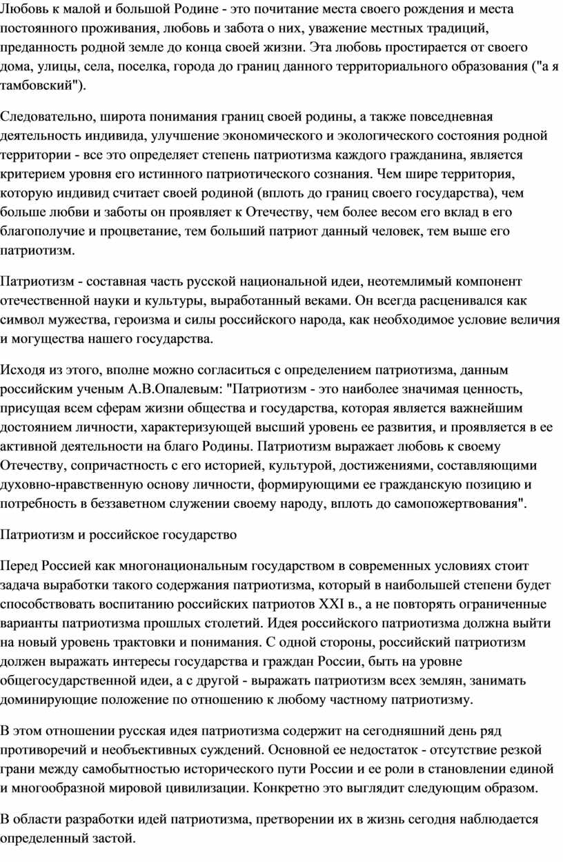 Исходя из этого, вполне можно согласиться с определением патриотизма, данным российским ученым А.В.Опалевым: "Патриотизм - это наиболее значимая ценность, присущая всем сферам жизни общества и государства, которая является важнейшим достоянием личности, характеризующей высший уровень ее развития, и проявляется в ее активной деятельности на благо Родины. Патриотизм выражает любовь к своему Отечеству, сопричастность с его историей, культурой, достижениями, составляющими духовно-нравственную основу личности, формирующими ее гражданскую позицию и потребность в беззаветном служении своему народу, вплоть до самопожертвования".