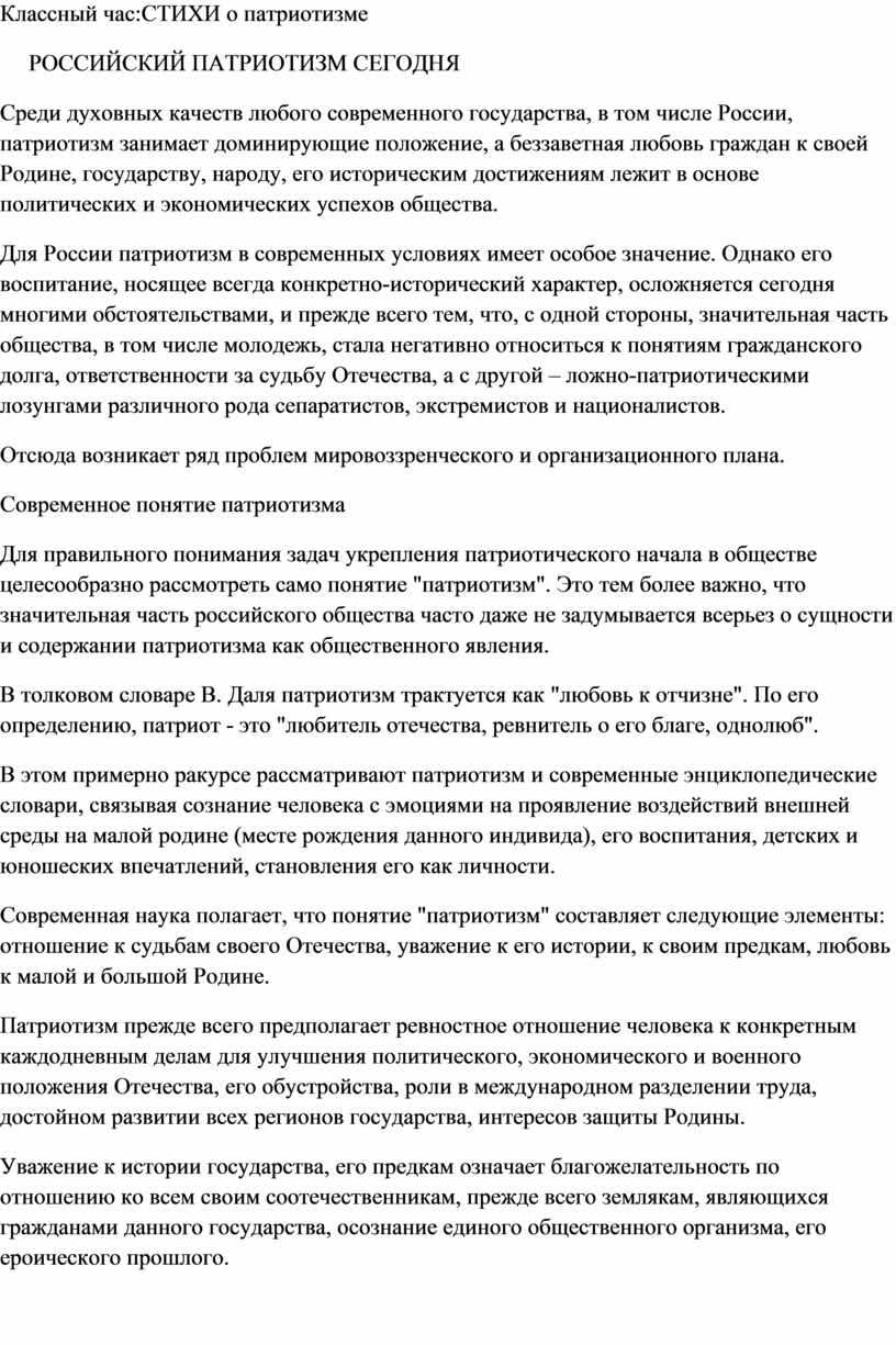 Классный час:СТИХИ о патриотизме