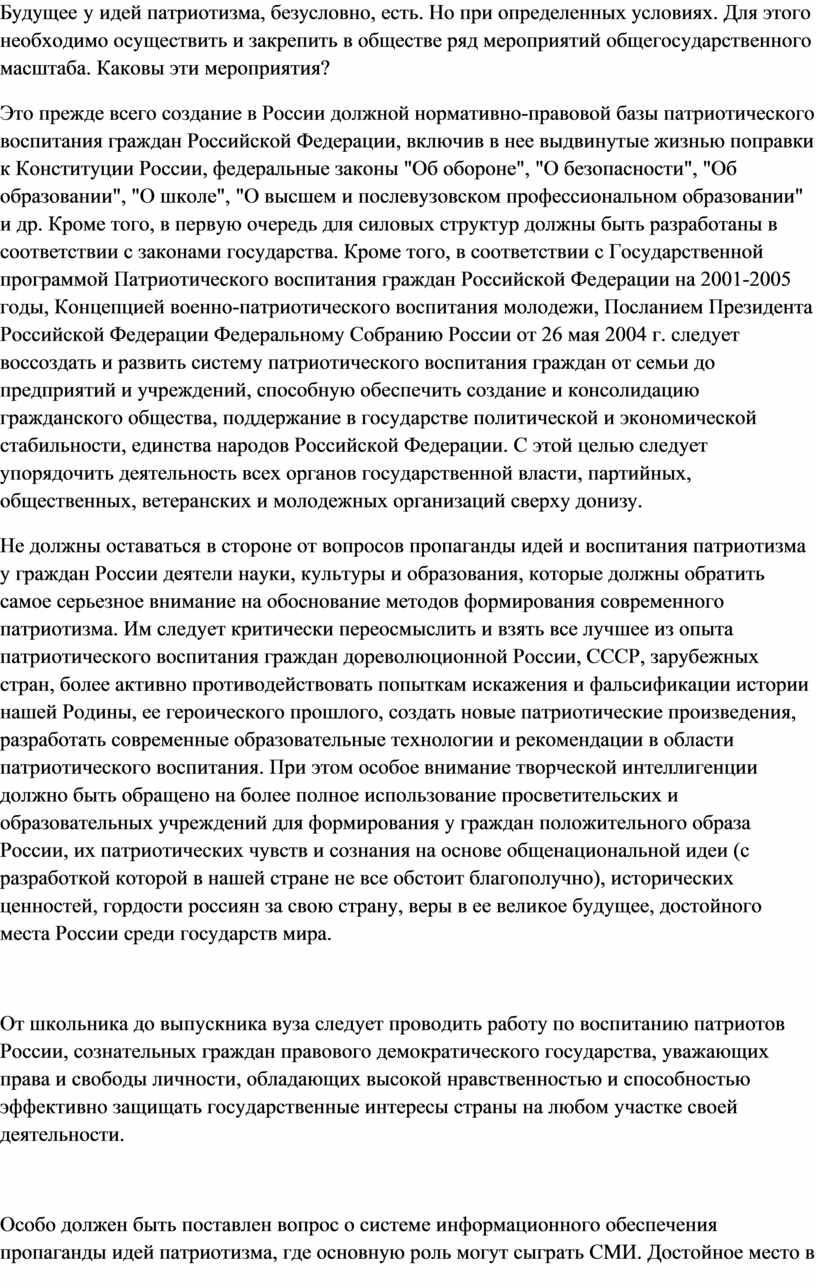 От школьника до выпускника вуза следует проводить работу по воспитанию патриотов России, сознательных граждан правового демократического государства, уважающих права и свободы личности, обладающих высокой нравственностью и способностью эффективно защищать государственные интересы страны на любом участке своей деятельности.