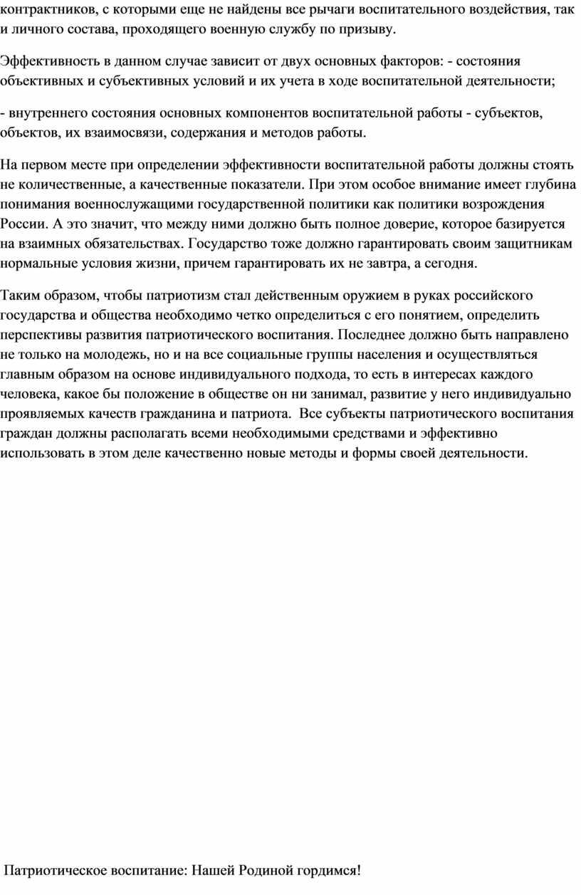 Таким образом, чтобы патриотизм стал действенным оружием в руках российского государства и общества необходимо четко определиться с его понятием, определить перспективы развития патриотического воспитания. Последнее должно быть направлено не только на молодежь, но и на все социальные группы населения и осуществляться главным образом на основе индивидуального подхода, то есть в интересах каждого человека, какое бы положение в обществе он ни занимал, развитие у него индивидуально проявляемых качеств гражданина и патриота. Все субъекты патриотического воспитания граждан должны располагать всеми необходимыми средствами и эффективно использовать в этом деле качественно новые методы и формы своей деятельности.
