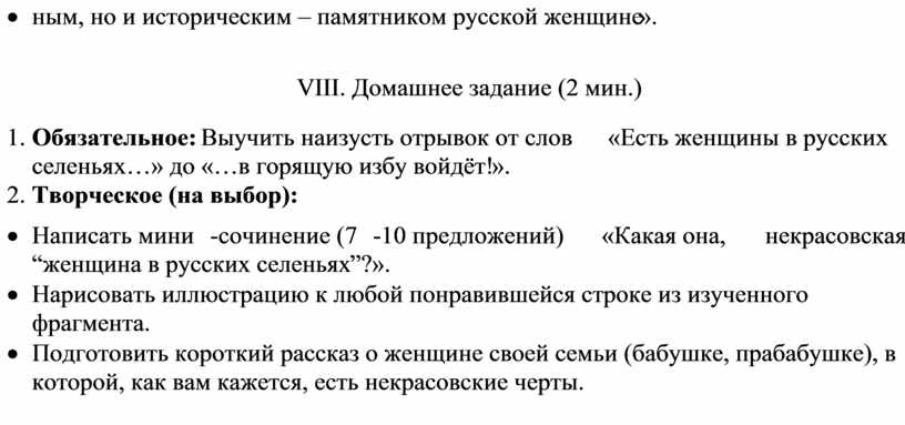 · Написать мини-сочинение (7-10 предложений) «Какая она, некрасовская “женщина в русских селеньях”?».