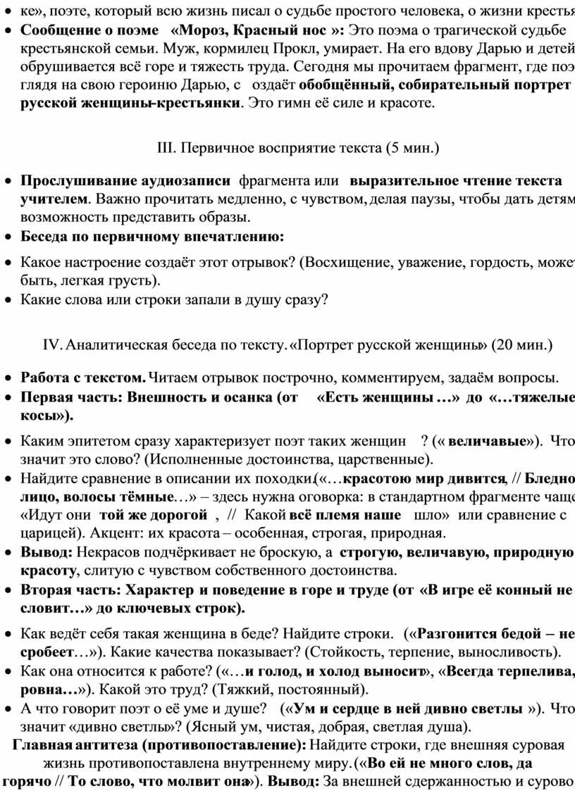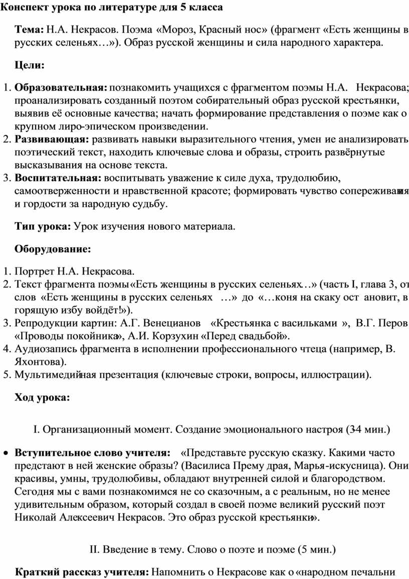· Вступительное слово учителя: «Представьте русскую сказку. Какими часто предстают в ней женские образы? (Василиса Премудрая, Марья-искусница). Они красивы, умны, трудолюбивы, обладают внутренней силой и благородством. Сегодня мы с вами познакомимся не со сказочным, а с реальным, но не менее удивительным образом, который создал в своей поэме великий русский поэт Николай Алексеевич Некрасов. Это образ русской крестьянки».