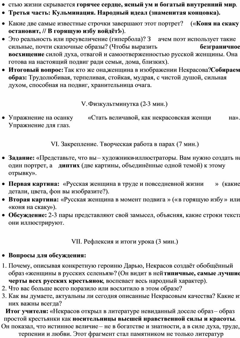 1. Почему, описывая конкретную героиню Дарью, Некрасов создаёт обобщённый образ «женщины в русских селеньях»? (Он видит в ней типичные, самые лучшие черты всех русских крестьянок, воспевает весь народный характер).