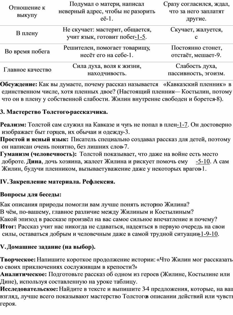 · Обсуждение: Как вы думаете, почему рассказ называется «Кавказский пленник» в единственном числе, хотя пленных двое? (Настоящий пленник — Костылин, потому что он в плену у собственной слабости. Жилин внутренне свободен и борется-8).