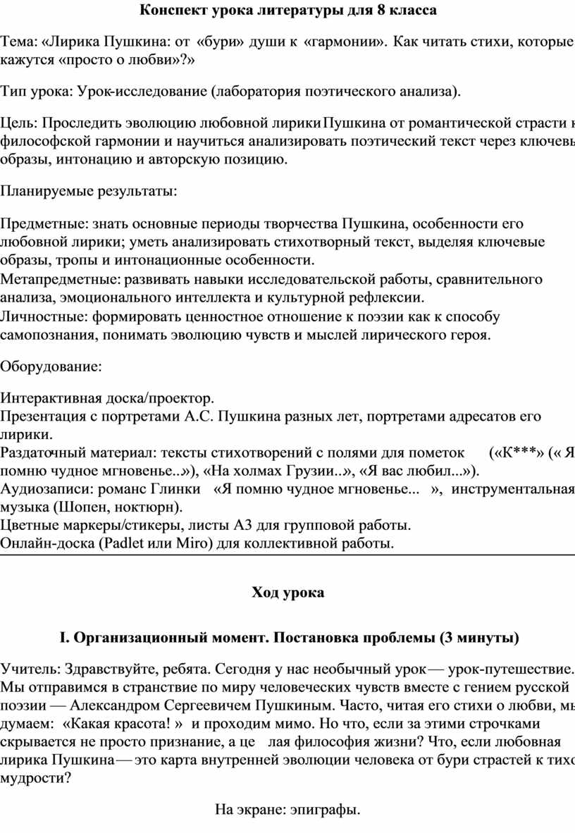 Учитель: Здравствуйте, ребята. Сегодня у нас необычный урок — урок-путешествие. Мы отправимся в странствие по миру человеческих чувств вместе с гением русской поэзии — Александром Сергеевичем Пушкиным. Часто, читая его стихи о любви, мы думаем: «Какая красота!» и проходим мимо. Но что, если за этими строчками скрывается не просто признание, а целая философия жизни? Что, если любовная лирика Пушкина — это карта внутренней эволюции человека от бури страстей к тихой мудрости?