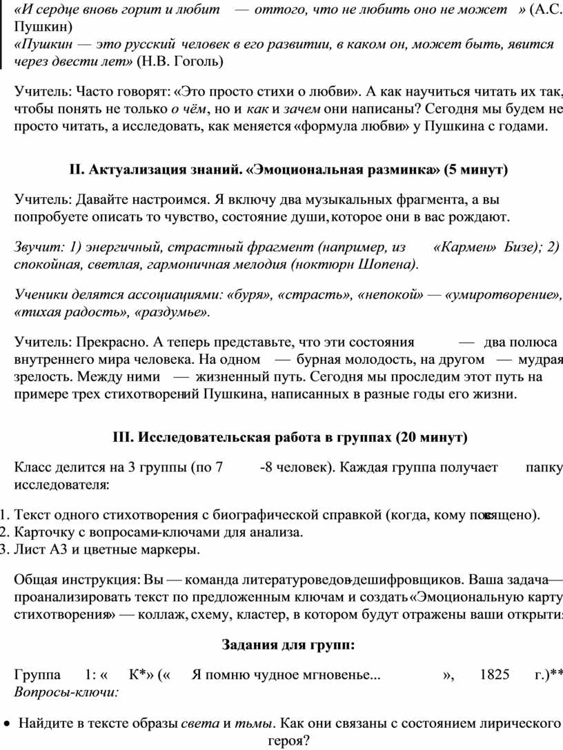 Учитель: Часто говорят: «Это просто стихи о любви». А как научиться читать их так, чтобы понять не только о чём, но и как и зачем они написаны? Сегодня мы будем не просто читать, а исследовать, как меняется «формула любви» у Пушкина с годами.