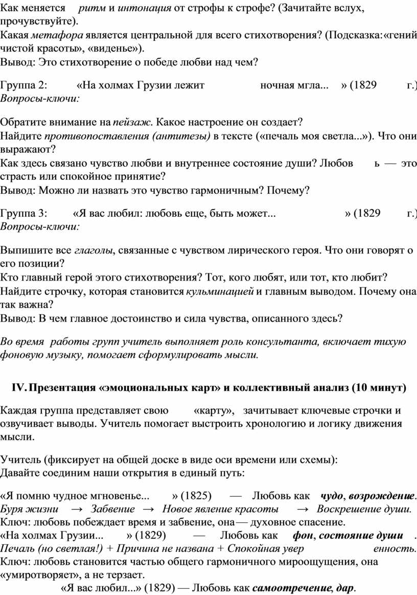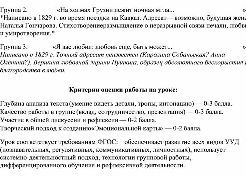 3. Раздаточный материал: тексты стихотворений с полями для пометок («К***» («Я помню чудное мгновенье...»), «На холмах Грузии...», «Я вас любил...»).