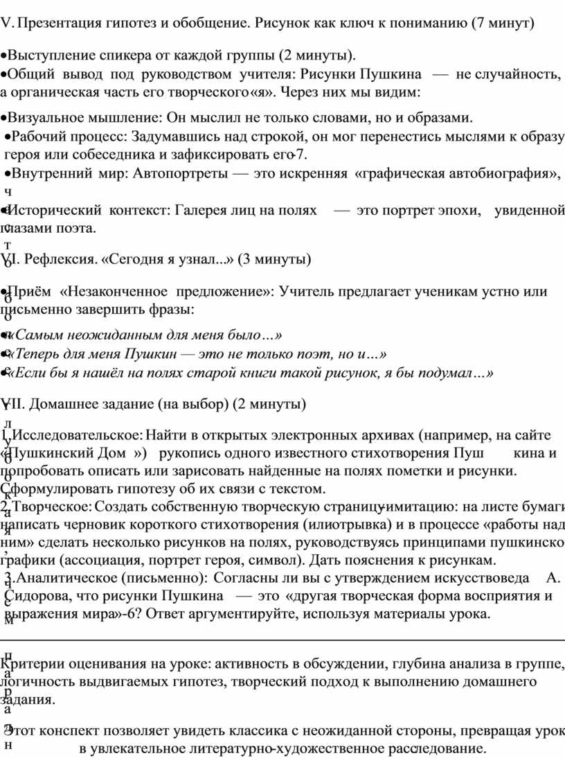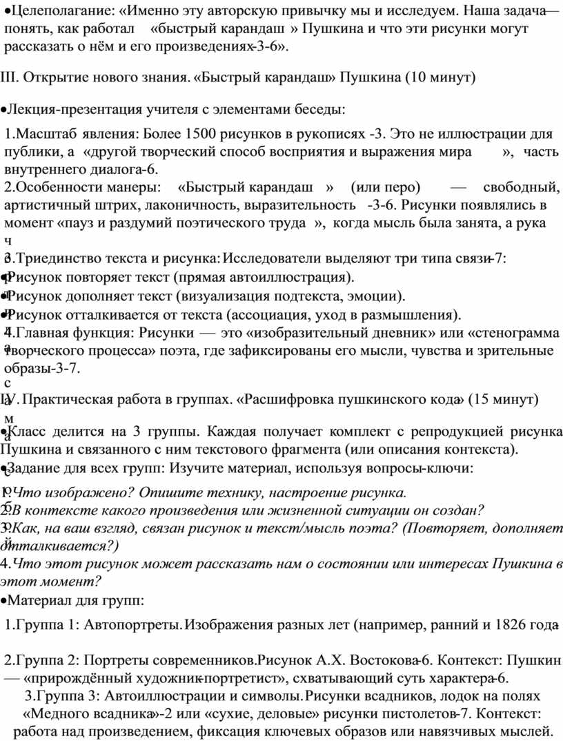 ·Вступительное слово учителя: «Ребята, мы привыкли видеть Пушкина сквозь призму его безупречных стихов. Но сегодня мы заглянем в его творческую лабораторию, в самый процесс рождения текста. Мы станем исследователями, которым предстоит расшифровать тайные знаки, оставленные самим поэтом. Представьте: на полях черновика рядом со строками о любви или размышлениях о судьбе — чей-то профиль, набросок коня, загадочный росчерк. Что это? Бездумная привычка или… второй, графический язык Пушкина?»