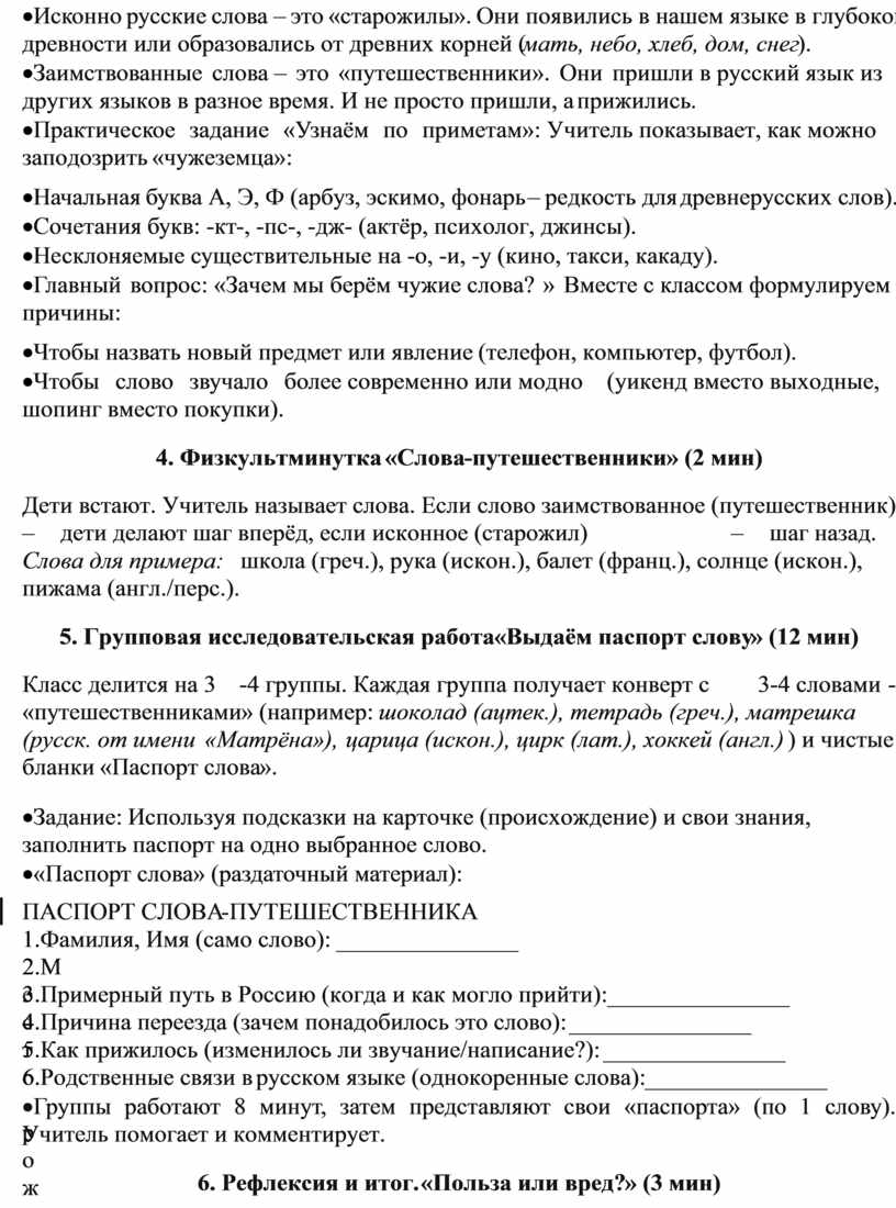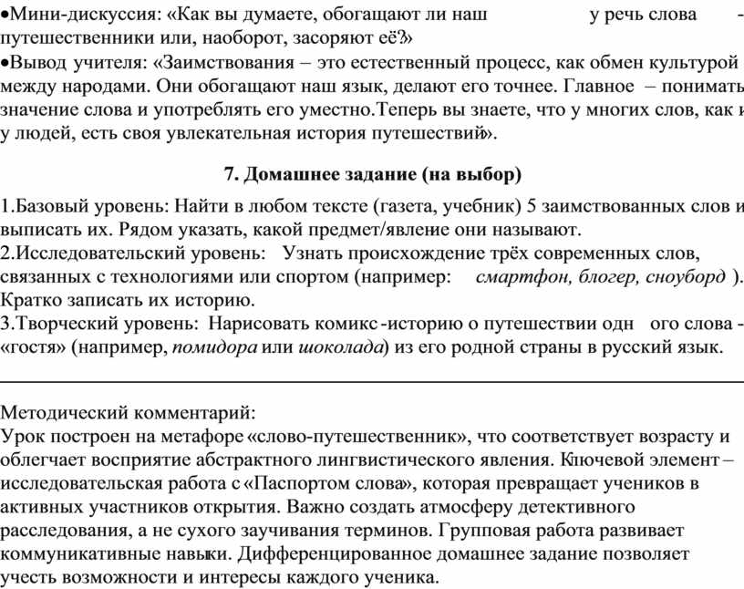 ·Вывод учителя: «Заимствования – это естественный процесс, как обмен культурой между народами. Они обогащают наш язык, делают его точнее. Главное – понимать значение слова и употреблять его уместно. Теперь вы знаете, что у многих слов, как и у людей, есть своя увлекательная история путешествий».