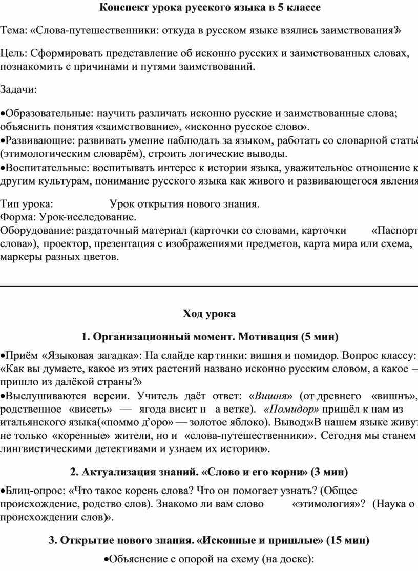 ·Выслушиваются версии. Учитель даёт ответ: «Вишня» (от древнего «вишнъ», родственное «висеть» — ягода висит на ветке). «Помидор» пришёл к нам из итальянского языка («поммо д’оро» — золотое яблоко). Вывод: «В нашем языке живут не только «коренные» жители, но и «слова-путешественники». Сегодня мы станем лингвистическими детективами и узнаем их историю».