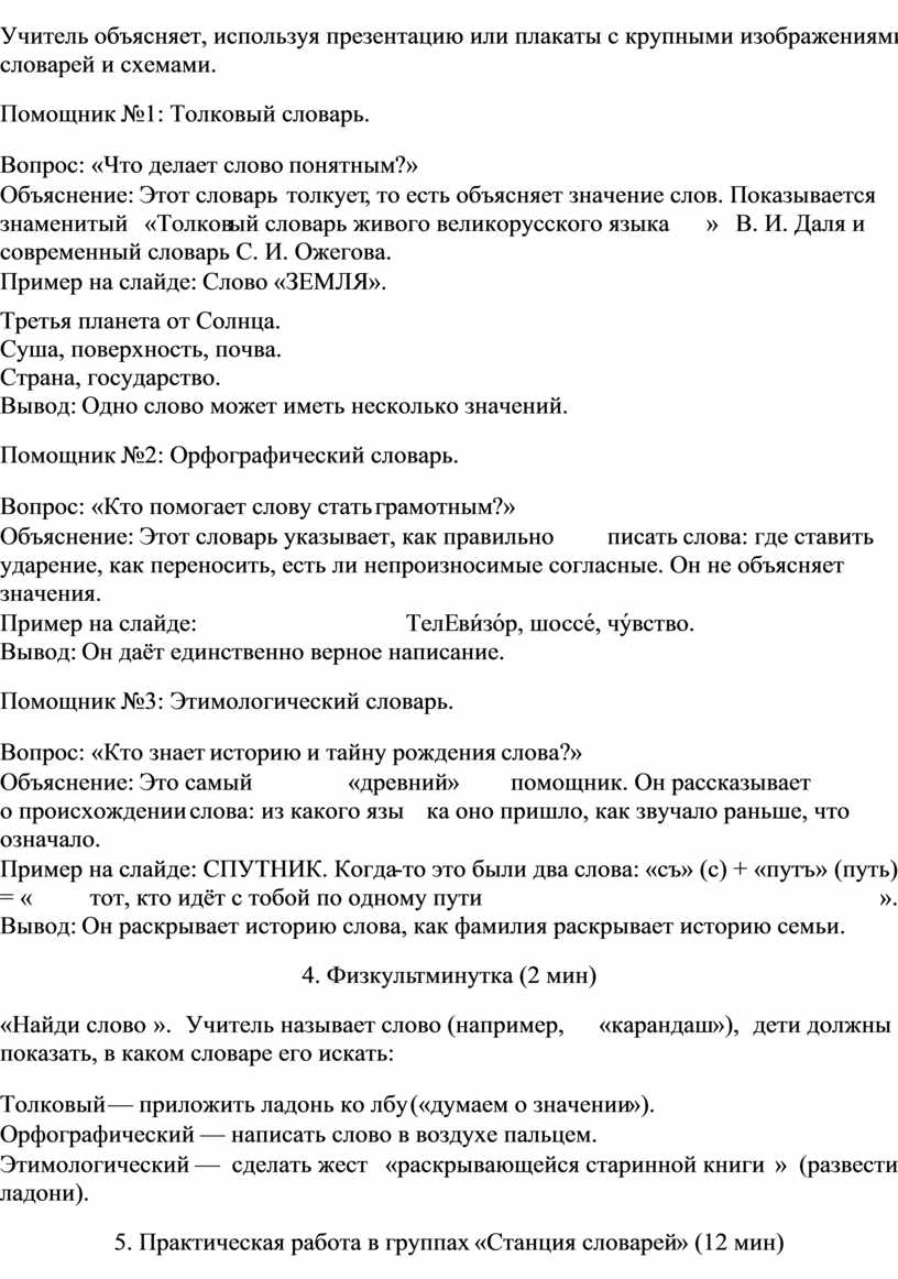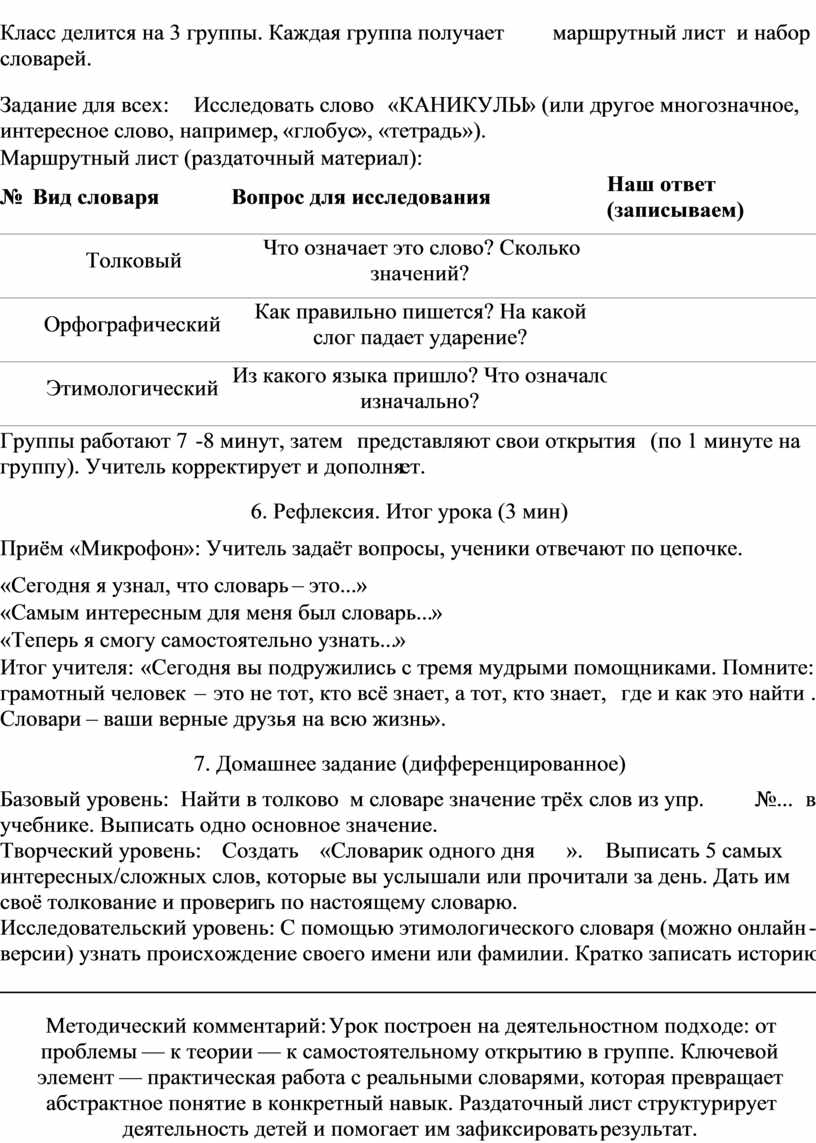 Методический комментарий: Урок построен на деятельностном подходе: от проблемы — к теории — к самостоятельному открытию в группе. Ключевой элемент — практическая работа с реальными словарями, которая превращает абстрактное понятие в конкретный навык. Раздаточный лист структурирует деятельность детей и помогает им зафиксировать результат.