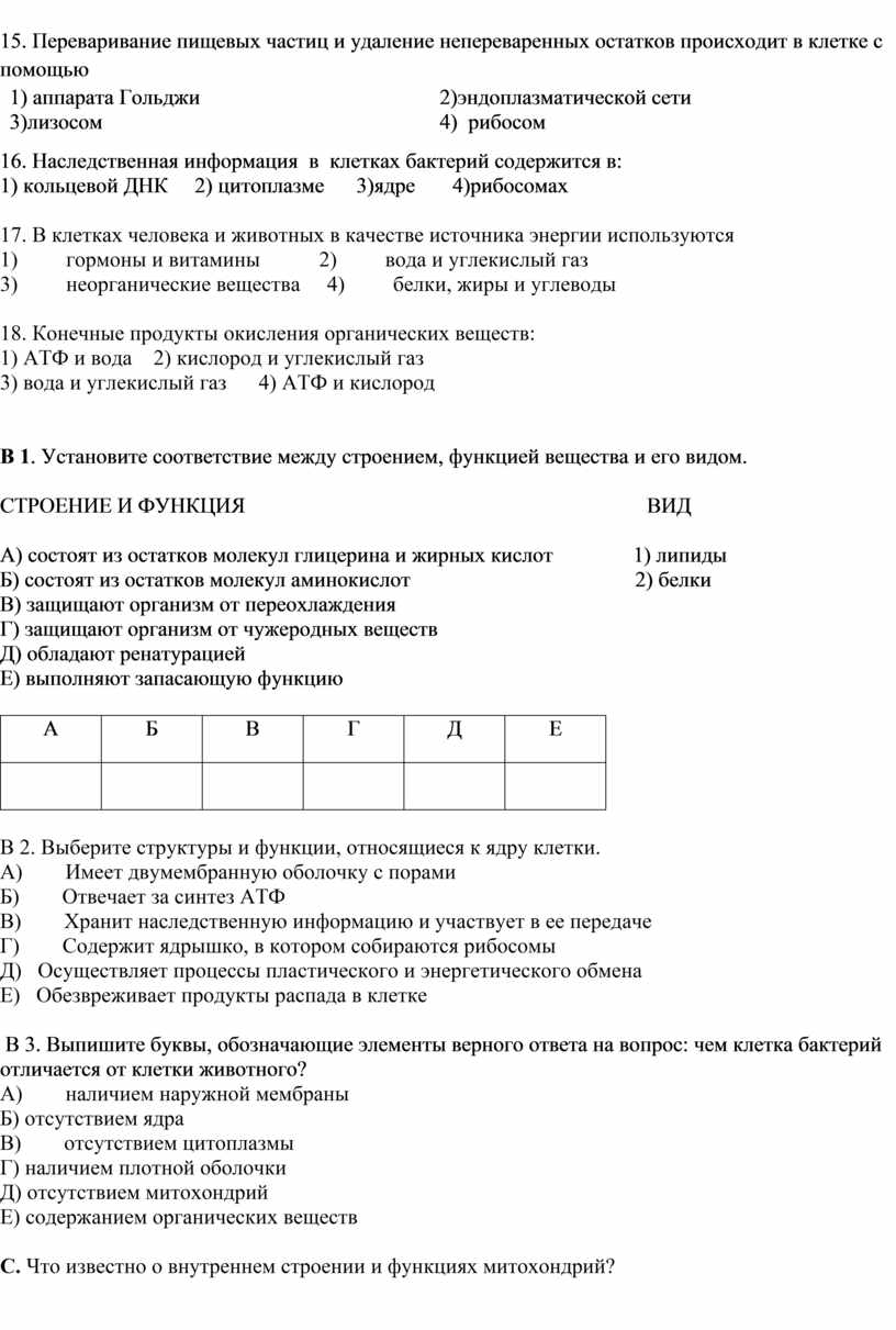 В 3. Выпишите буквы, обозначающие элементы верного ответа на вопрос: чем клетка бактерий отличается от клетки животного?