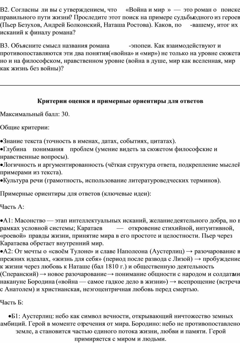 В2. Согласны ли вы с утверждением, что «Война и мир» — это роман о поиске правильного пути жизни? Проследите этот поиск на примере судьбы одного из героев (Пьер Безухов, Андрей Болконский, Наташа Ростова). Каков, по-вашему, итог их исканий к финалу романа?