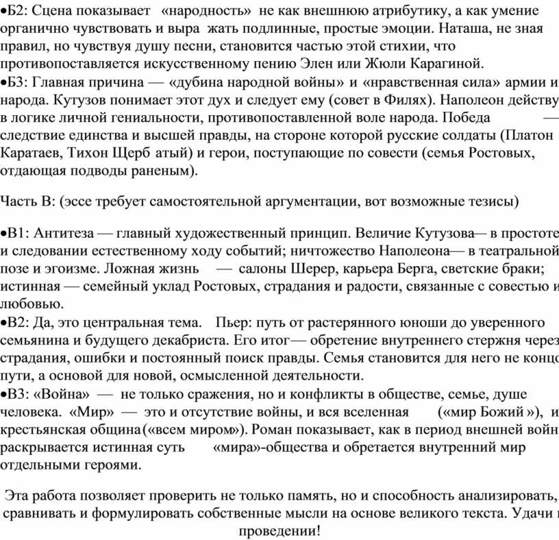 ·Б3: Главная причина — «дубина народной войны» и «нравственная сила» армии и народа. Кутузов понимает этот дух и следует ему (совет в Филях). Наполеон действует в логике личной гениальности, противопоставленной воле народа. Победа — следствие единства и высшей правды, на стороне которой русские солдаты (Платон Каратаев, Тихон Щербатый) и герои, поступающие по совести (семья Ростовых, отдающая подводы раненым).