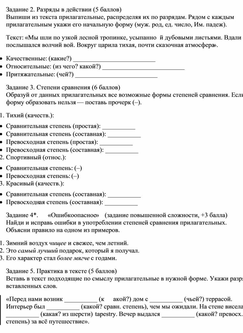 · Зад.5: Возможные ответы: (жаркий, качеств.), (жарче, кач. в сравн. ст.), (каменный, относит.), (прекраснейший / самый прекрасный, кач. в превосх. ст.), (собачий, притяж.).